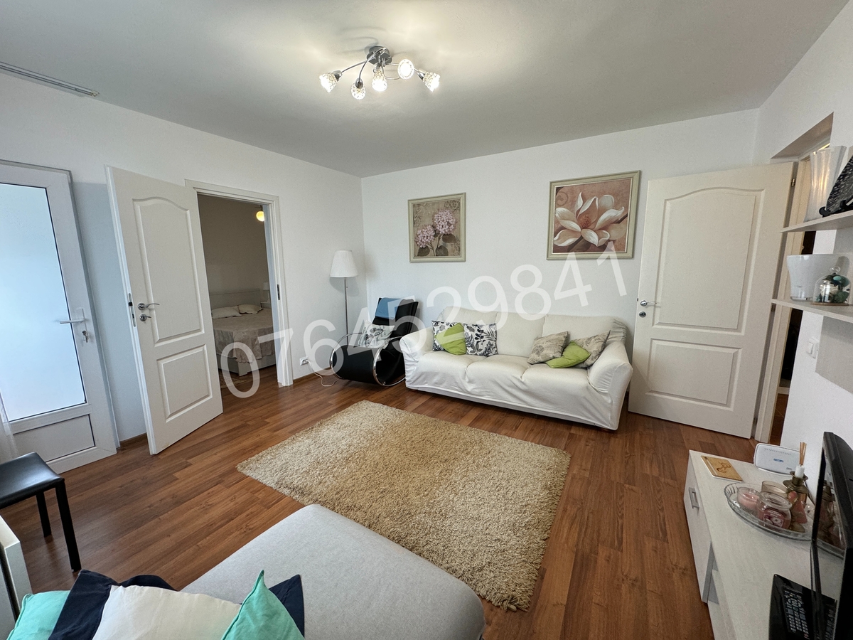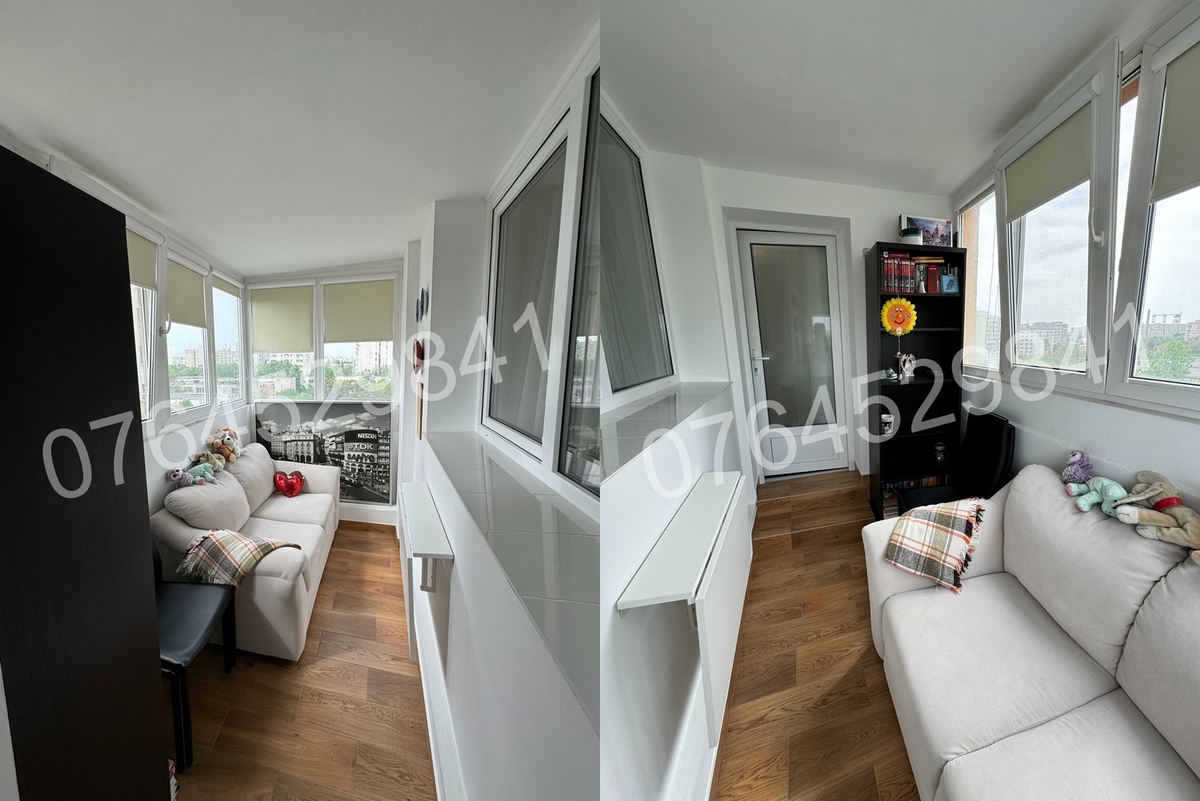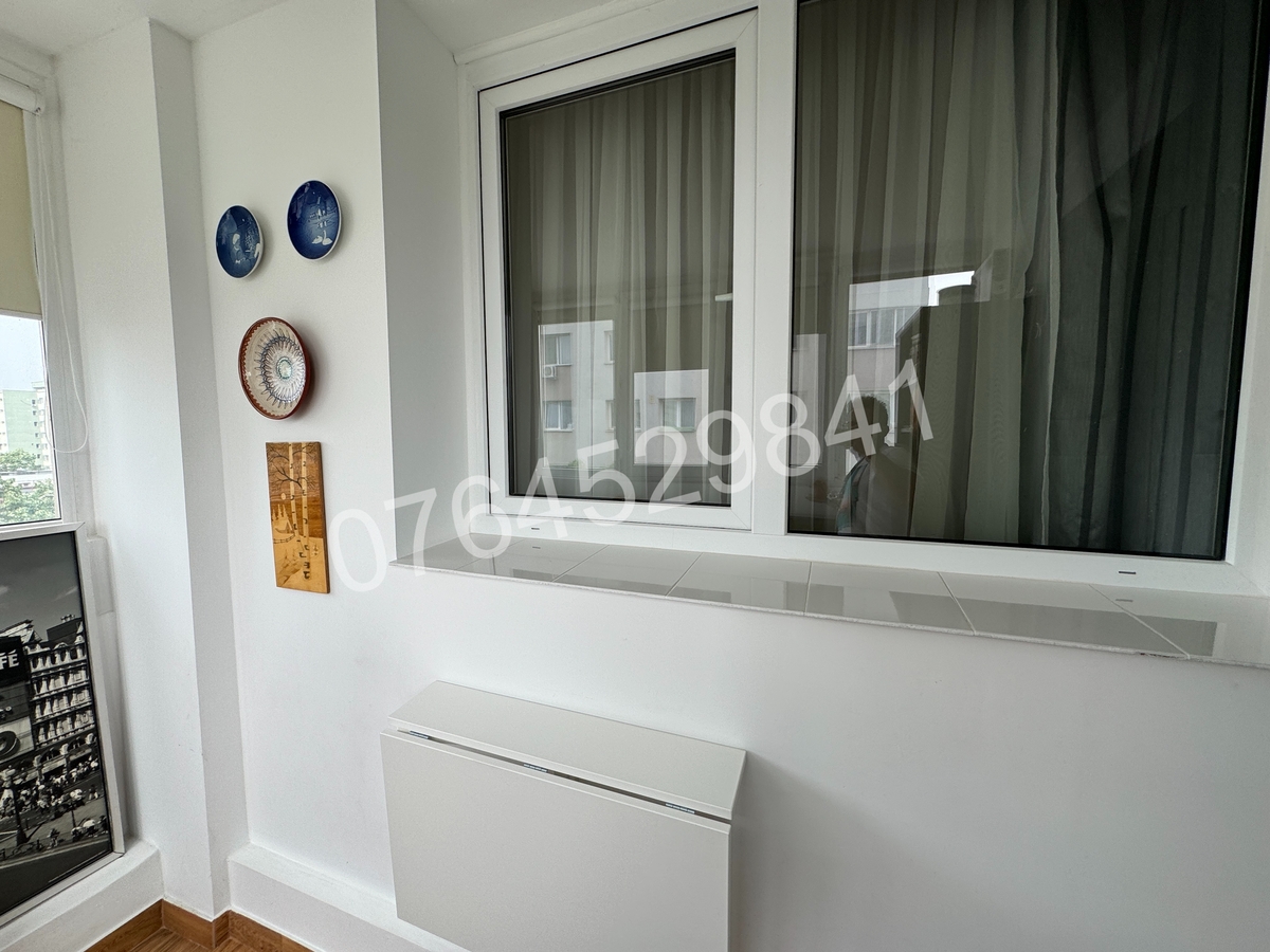 Balcon inchis in termopan si mobilat s-a creeat o zona de relaxare,aer conditionat nou,televizor led,canapea extensibila in living,pat matrimonial in dormitor, plita pe gaz+cuptor electric incorporate,hota,cuptor cu microunde,masina de spalat rufe,combina frigorifica.
