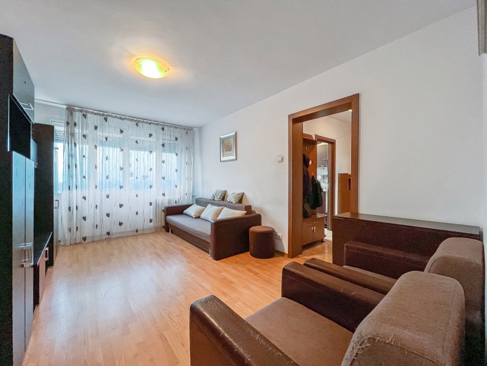 Apartamentul se afla la etajul 9 din 10 intr-un bloc izolat termic si este compus din hol cu spatiu de depozitare mare, bucatarie, living, un alt hol din care se intra in baie si in cele doua dormitoare, plus balcon. Unul dintre dormitoare este nemobilat insa poate fi mobilat in functie de nevoie.