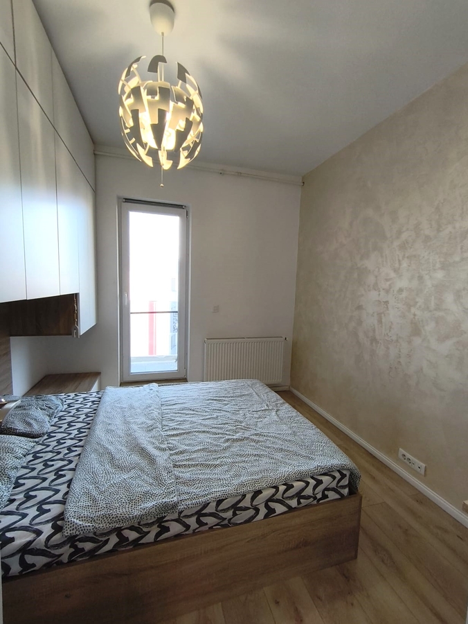 Apartamentul este complet mobilat si utilat, cu mobilier modern si electrocasnice noi. Compartimentare practica: living luminos, 2 dormitoare, bucatarie complet echipata, bai moderne. Finisaje de calitate si vedere deschisa.