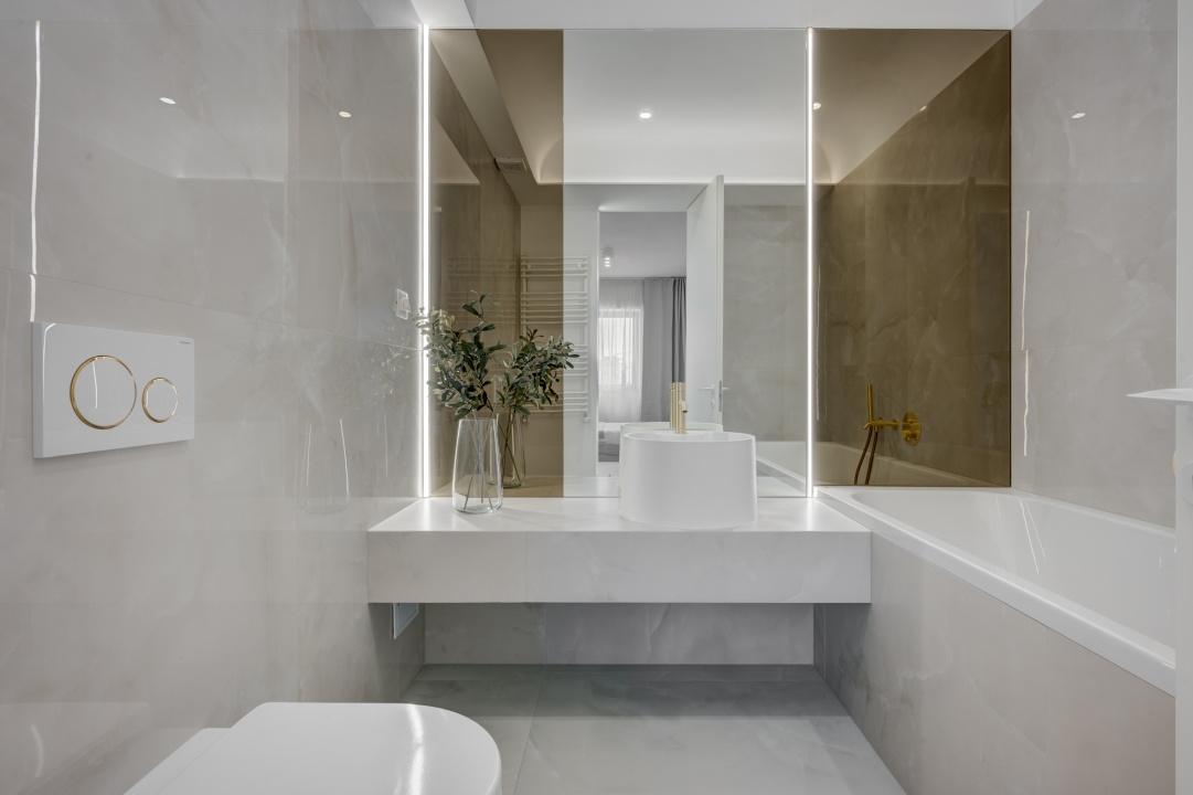 Finisajele sunt de calitate premium: tamplarie Schuco cu geam tripan, ceramica Porcelanosa, obiecte sanitare Daniel Rubinetterie, usi Pinum si Filomuro, iar confortul termic este asigurat de centrala termica proprie si sistem de aer conditionat multisplit Daikin.