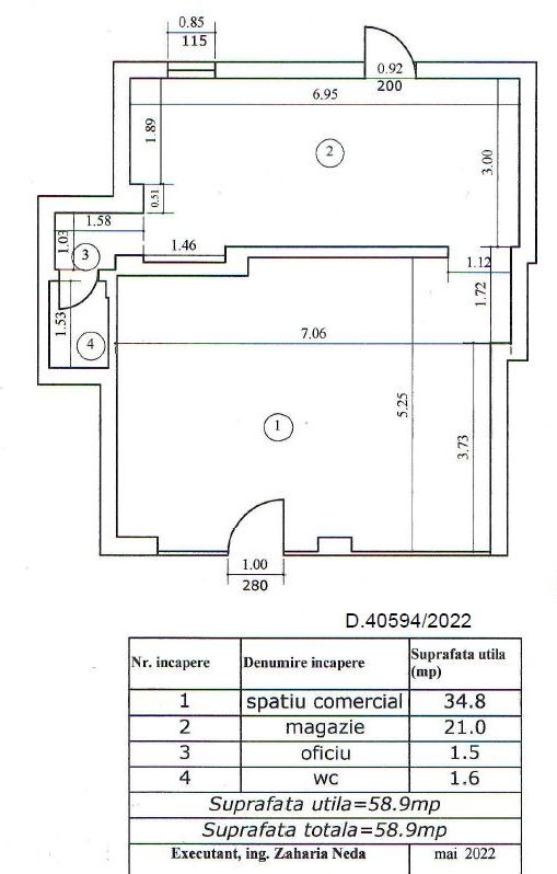 Spatiu este amenajat, are 59 mp, intrere din fata si spate, si a functionat ca si magazin alinemtar, brutarie si cofetarie.