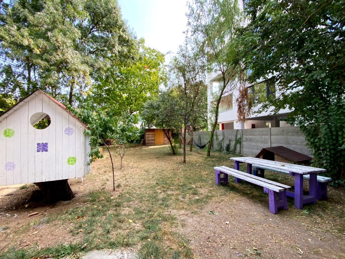 Curtea are 350mp, o casuta in copac pentru copii, 2 hamace, o debara pentru depozitare si cativa copaci maturi si roditori (prun, par, nuc). Necesita atentie si implicare pentru a arata frumos.