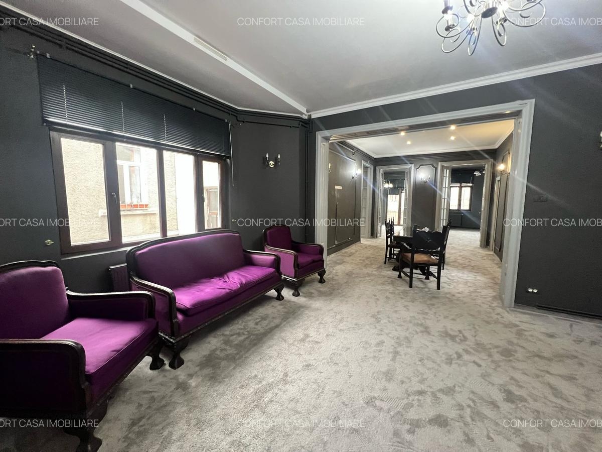 Agentia Confort Casa va propune spre inchiriere un apartament de 5 camere la etajul 1/1 din vila situata central, pe o strada de case, cu intrare separata, retrasa de la bulevardul principal, perfecta pentru rezidenta/ showroom fashion/ centru activitati.