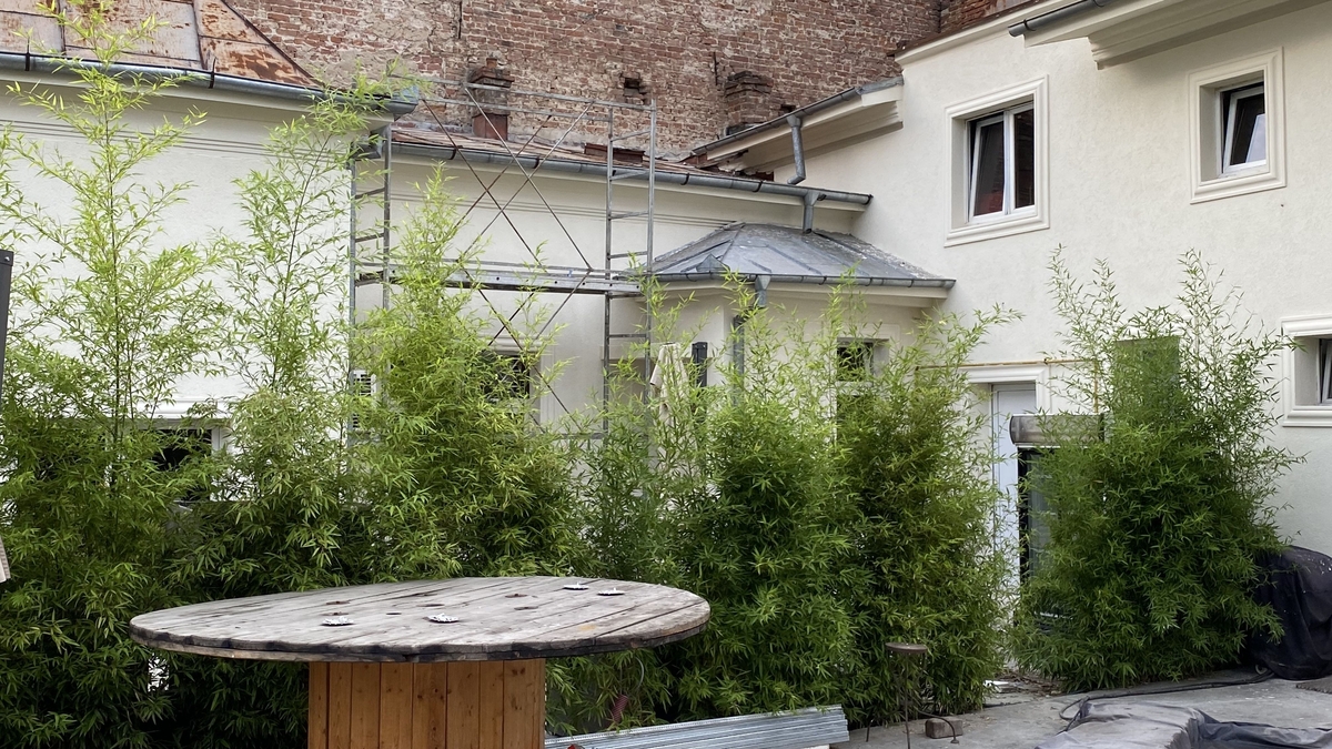 Terasa 45mp imprejmuita cu gard inalt de bambusi.