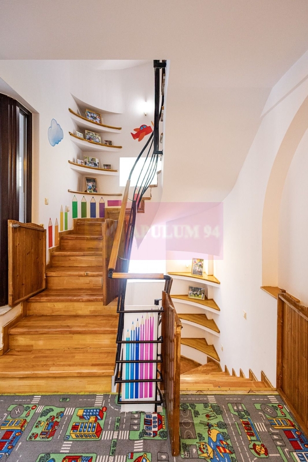 Vila este finalizata dupa anul 2004, structurata pe 4 nivele, Demisol, Parter, Etaj si Mansarda, cu o suprafata utila de aproximativ 120mp/nivel. La Demisol avem adapost de tip ALA, doua camere tehnice, centrala termica de mare putere, rezervor 1000 de litri apa menajera, bucatarie echipata cu aparatura profesionala, grup sanitar cu dus pentru personal la demisol. Parterul este primitor si luminos, cu zona de depozitare, cu sali pentru activitati si/sau odihna, luat masa, camera pentru citit cu semineu, zona de joaca, birou -personal administrativ, acces terasa si curte, curtea este suficient de spatioasa pentru tot felul de activitati, aproximativ 250mp, la etaj se urca pe o frumoasa scara, etaj unde avem deasemenea mai multe sali multifunctionale ce pot fi folosite atat pentru activitati diverse, tot aici avem si un grup sanitar spatios cu strictul necesar pentru cei mici, un balcon mare tip terasa cu vedere spre curtea proprie, mansarda este gandita ca un apartament pentru locuit dar se poate schimba ca destinatie daca se doreste, aici ne bucuram de spatii mari, ferestre tip velux, si de multa lumina naturala ca de fapt in intreaga vila. Inaltimea camerelor permite asfel orice artificiu de design si amplasarea de aparatura si mobilier.