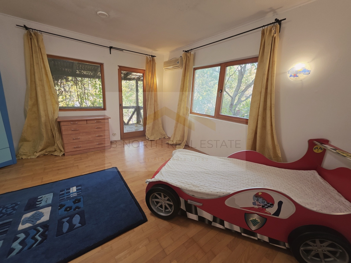 The upper floor includes five bedrooms, among which the master suite enjoys a stunning lake view directly from the bed, a private dressing room, and an en-suite bathroom with a shower and a jacuzzi. Two additional bathrooms and another balcony with panoramic garden and forest views complete the layout.