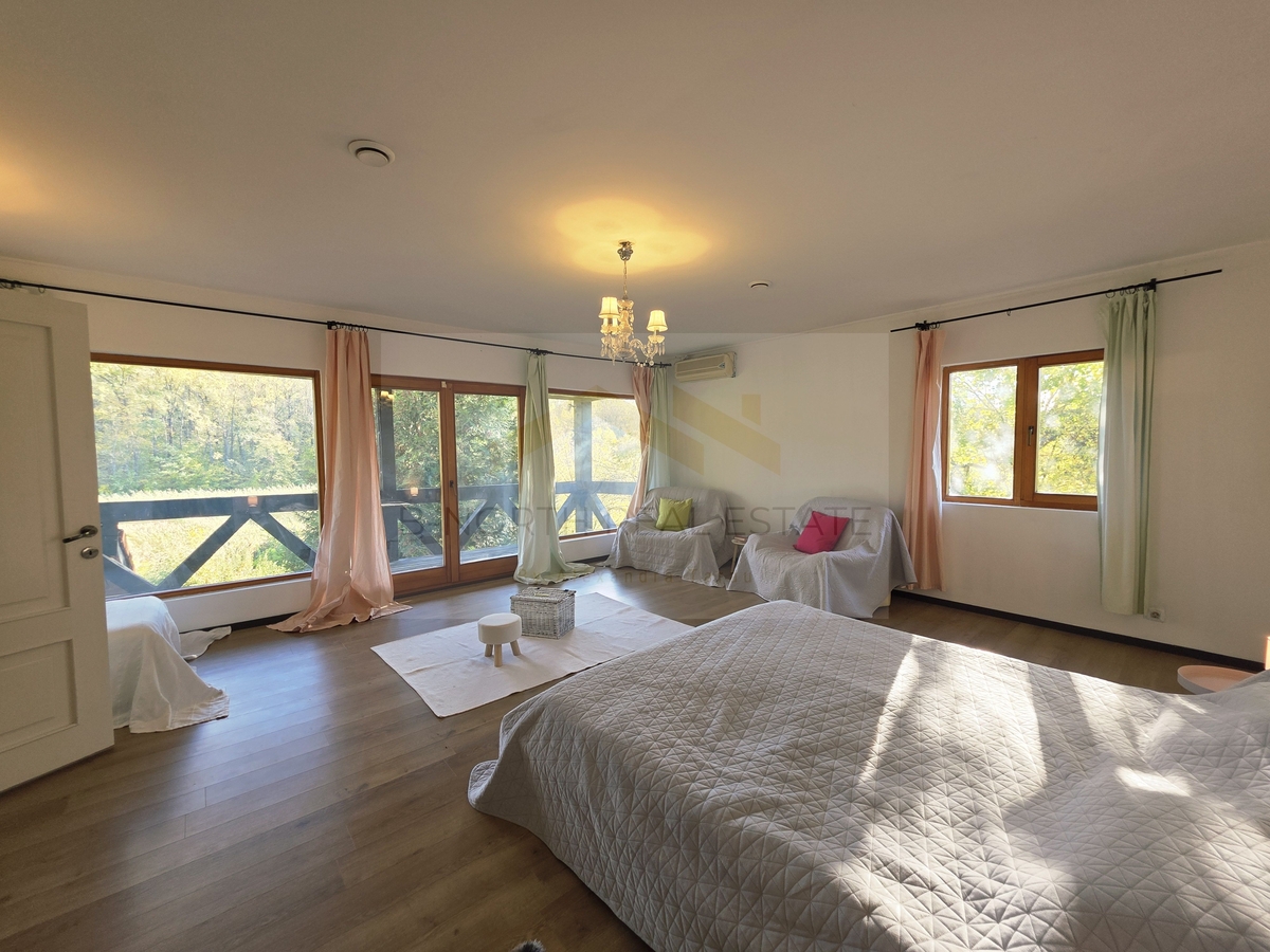 The upper floor includes five bedrooms, among which the master suite enjoys a stunning lake view directly from the bed, a private dressing room, and an en-suite bathroom with a shower and a jacuzzi. Two additional bathrooms and another balcony with panoramic garden and forest views complete the layout.