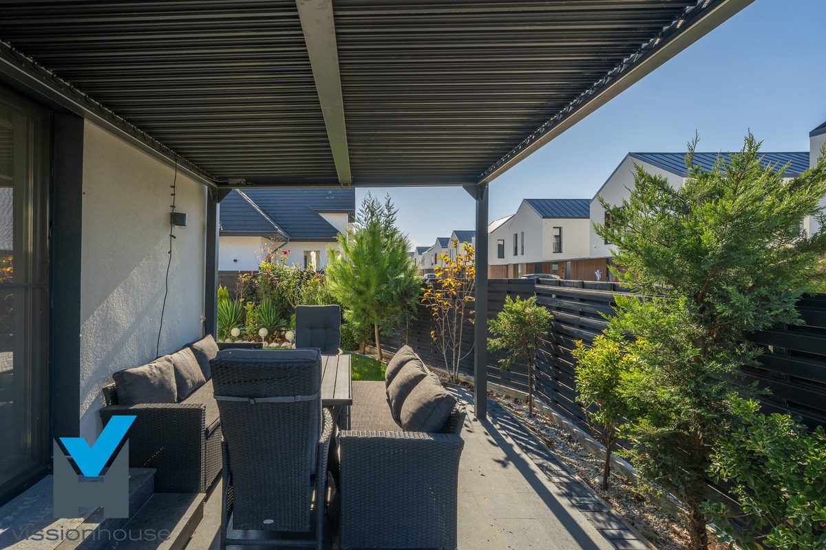 • Terasa acoperita, dotata cu mobilier de exterior si pergola metalica ce ofera un cadru perfect pentru relaxare si socializare.
