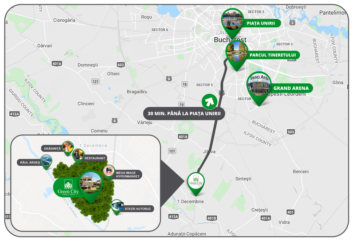 2 locuri de parcare! 35 min de P. Unirii. Asezat in linistea periferiei zonei metropolitane a Bucurestiului, Green City ofera o experienta de trai extraordinara pe terenurile istorice ale fostului domeniu regal al Reginei Maria.