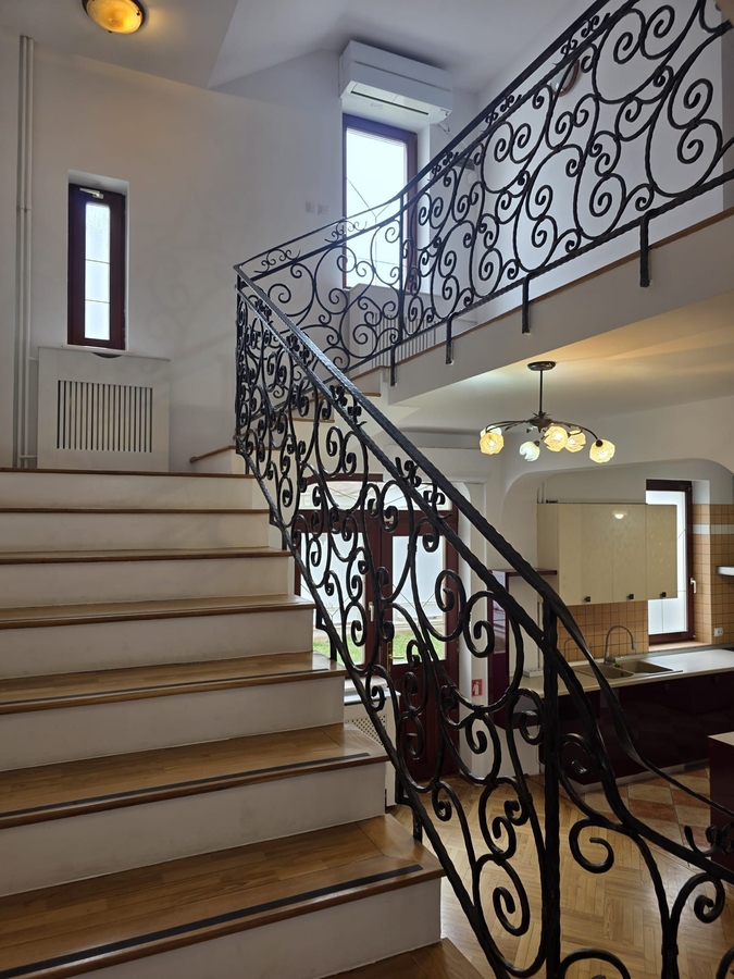 Proprietatea beneficiaza de garaj subteran, scara interioara eleganta cu elemente decorative din fier forjat, parchet din lemn masiv, ferestre ample care ofera lumina naturala pe tot parcursul zilei si o bucatarie complet echipata.