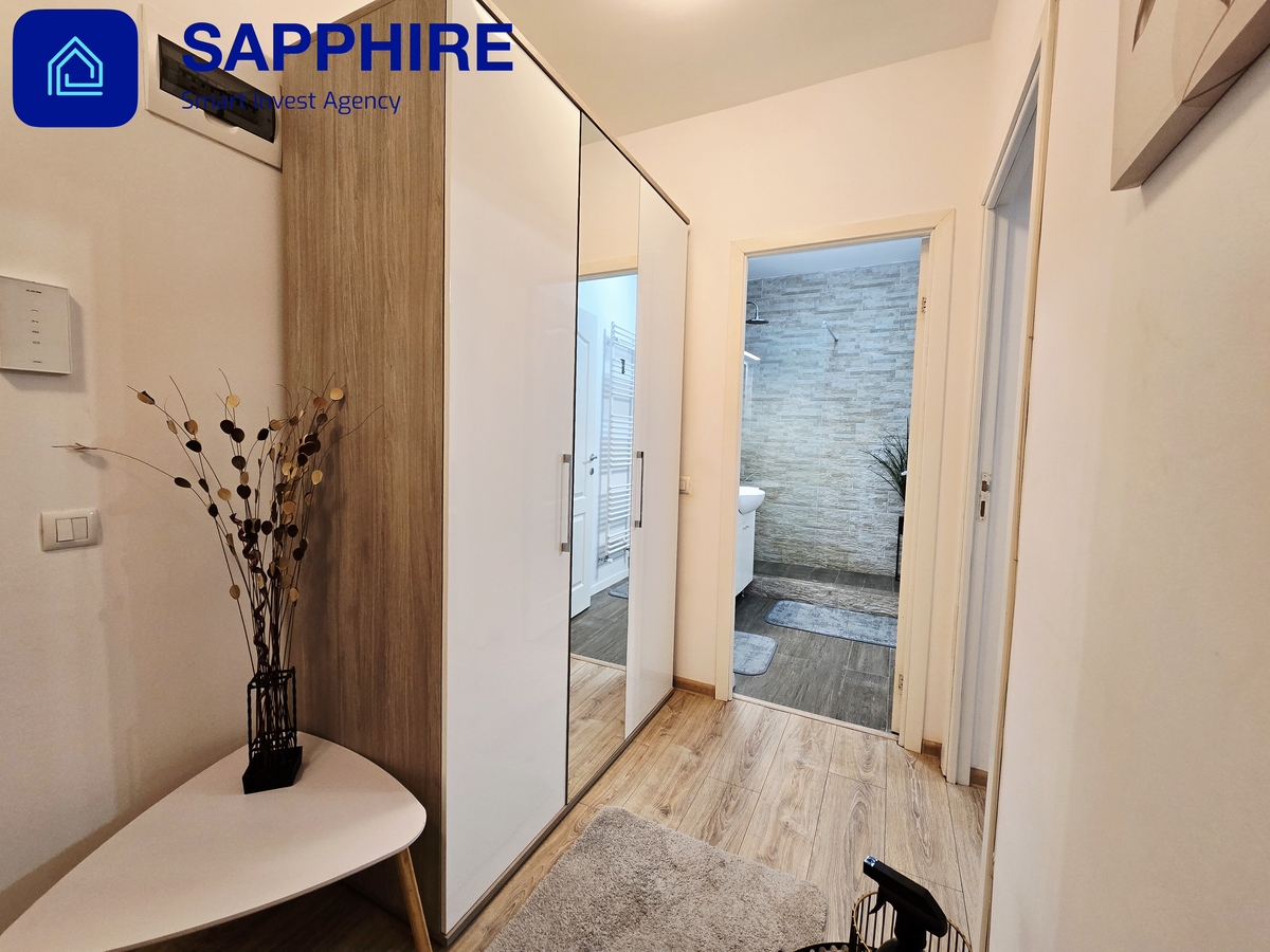 Mobilata si utilata complet: centrala termica proprie, aer conditionat, masina de spalat, frigider, aragaz, hota, televizor, fier de calcat, aspirator, etc.