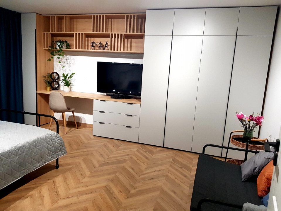 Garsoniera este complet mobilata si utilata cu produse de inalta calitate si se afla la prima inchiriere pe termen lung.