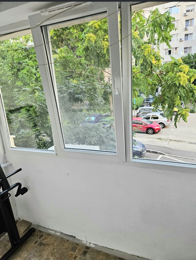 Balconul tip loggie inchis are vedere spre zona verde din spatele blocului,