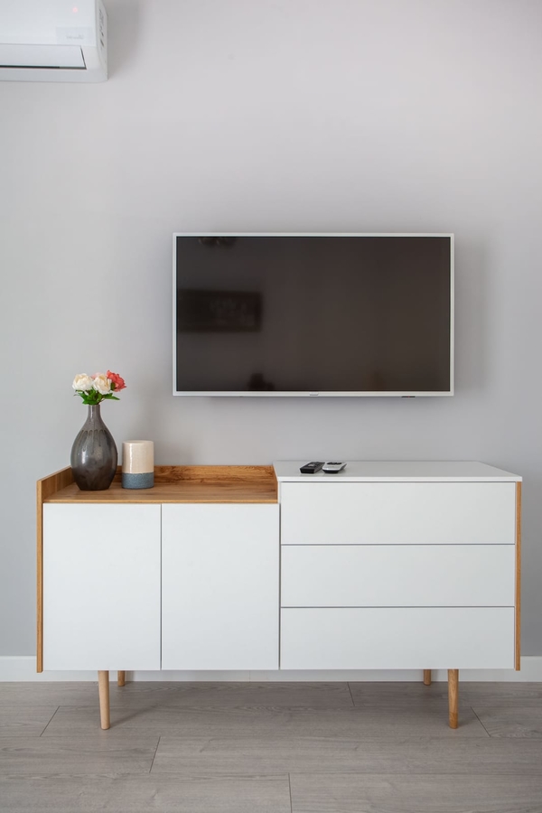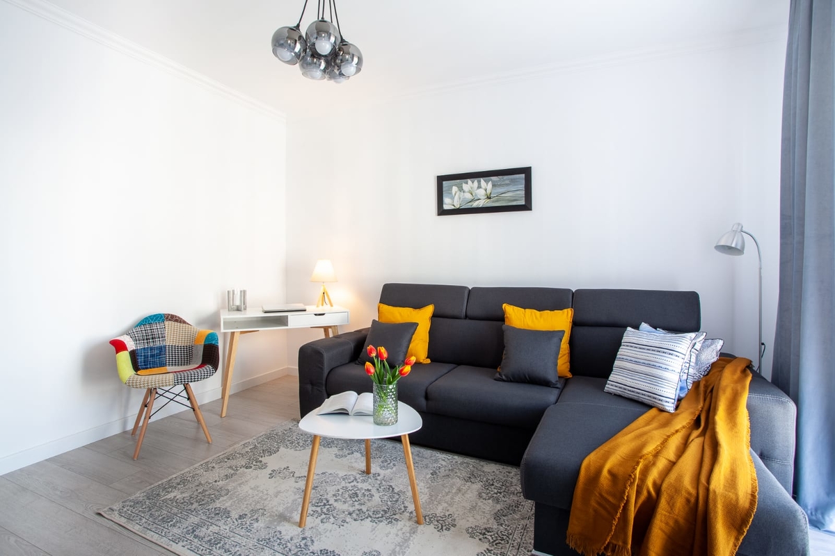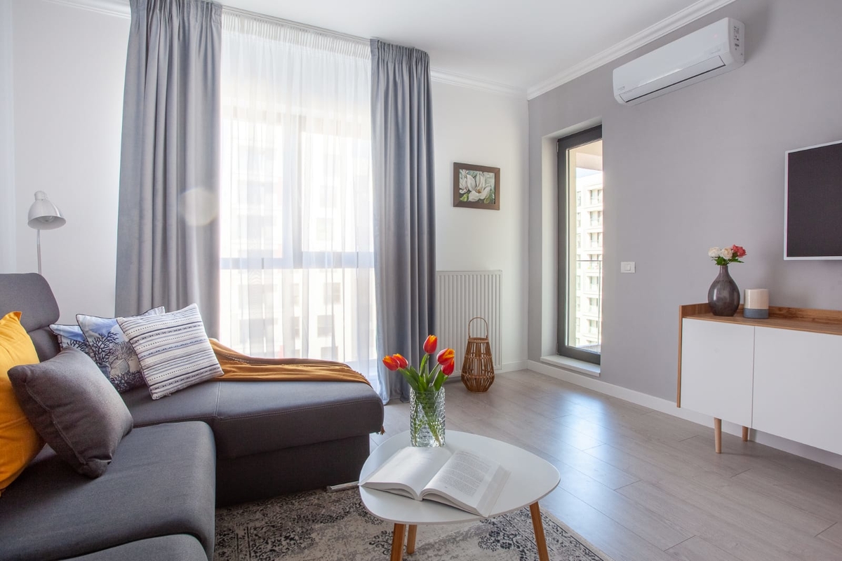 Bucutaria are iesire in bancon.Livingul este spatios, are o canapea extensibila cu sezlong (care poate deveni un pat de 140x200cm, cu lada de depozitare), masuta de cafea, birou, fotoliu, comoda TV, aer conditionat, lampadar, veoiza.Livingul are iesire in balcon.Baia este moderna, cu cabina de dus, WC incastrat, dulap suspendat si baza dulap cu lavoar.