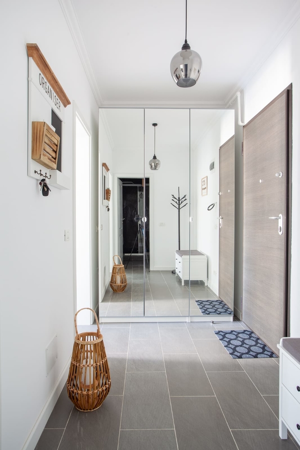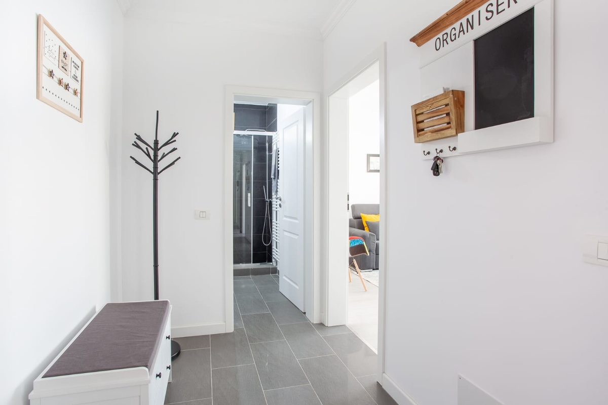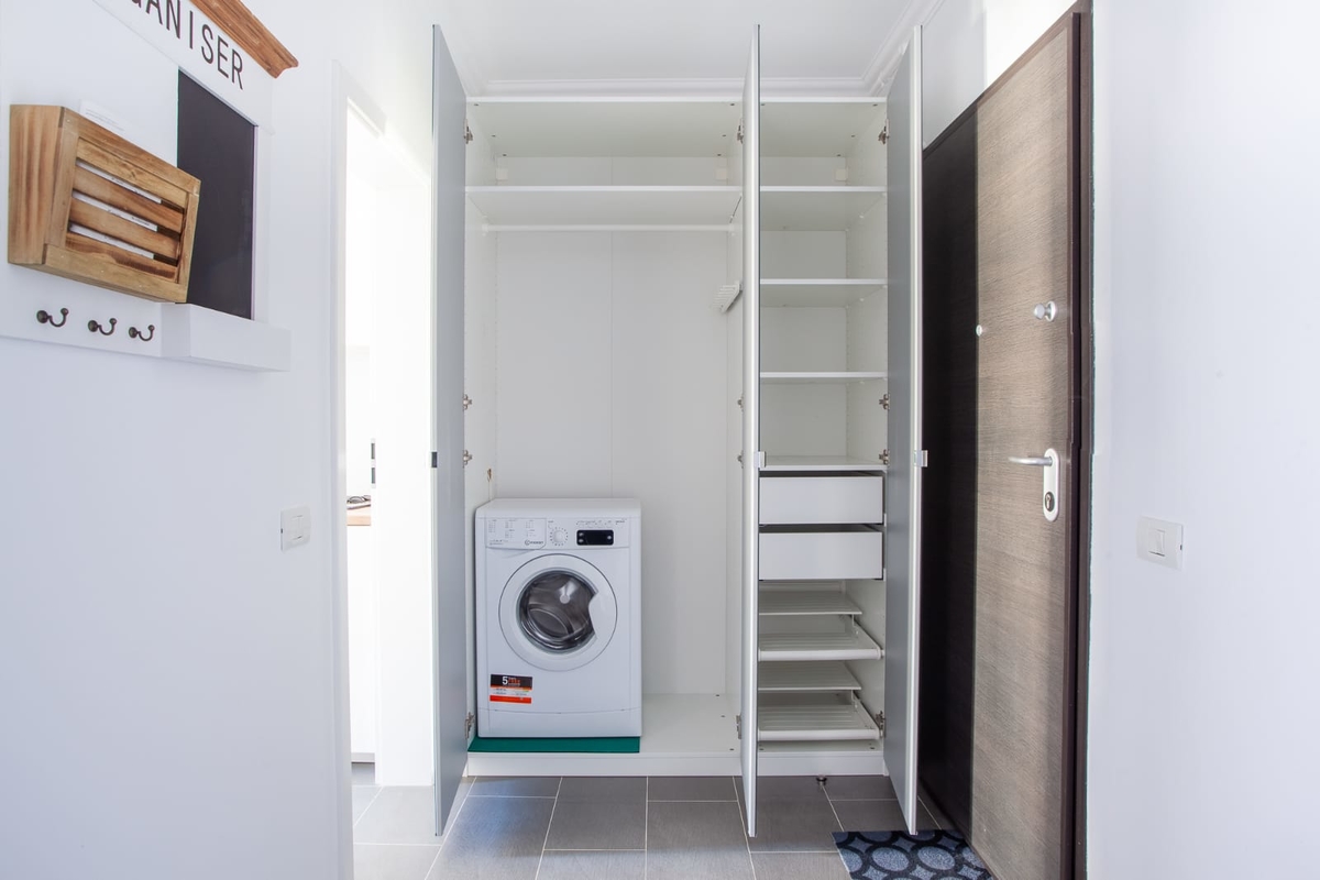Holul este generos si este mobilat cu un dressing Ikea in care este incorporata masina de spalat automata, are un cuier si o bancuta cu sertare.