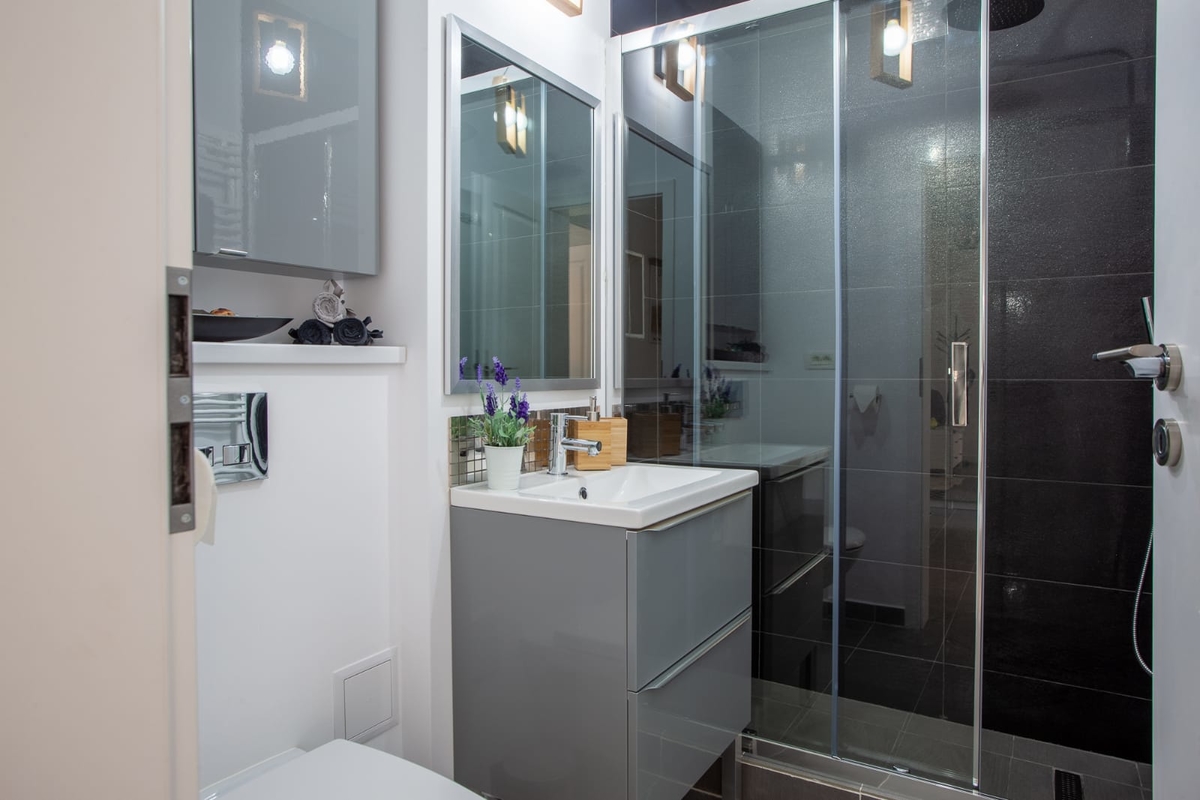 Este dotata cu suport hartie igienica, perie wc, cos inox cu pedala, cuier inox, calorifer port prosop, prosoape si alte accesorii.