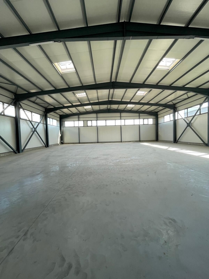 Hala industriala in suprafata de 525 mp este constructie metalica noua construita pe structura de metal cu stalpi si grinzi metalice, iar peretii si acoperisul sunt din panouri sandwich cu spuma poliuretanica si grosimea de 8 cm. Deschiderea halei este de 21 ml cu 25 latime fara stalpi interiori. Inaltimea la streasina este de 5 ml iar la coama de 6,30 ml. Pardoseala in interior este din beton armat elicopterizat rezistent la greutati industriale. Accesul in interior se face pentru marfuri pe o usa industriala rabatabila pe tavan din PVC cu dimensiunea de 4x4,50 m, iar pentru pietoni exista usa pietonala. In interior exista grup sanitar propriu si un birou. Dispune de curent de 220 si 380 cu putere instalata de 15 KVA, de alimentare cu apa si canalizare. In fata halei sunt locuri proprii de parcare. Este libera si pregatita pentru inchiriere. Pretul cerut este de 7 euro/mp la care se adauga TVA. Comisionul agentiei imobiliare este incepand cu 50%+TVA din chiria unei luni.