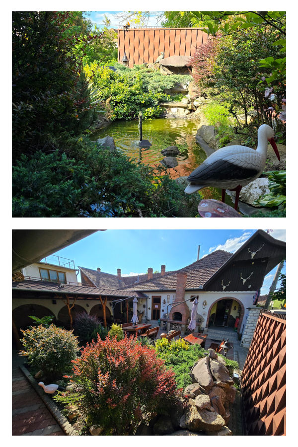 Designul reflecta un stil traditional, cu accente rustice, inclusiv un bar decorat cu piatra naturala si decoratiuni autentice, un iaz cu o fantana si elemente naturale, creand o atmosfera primitoare.