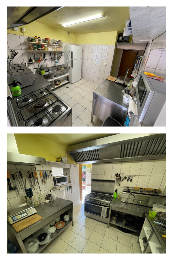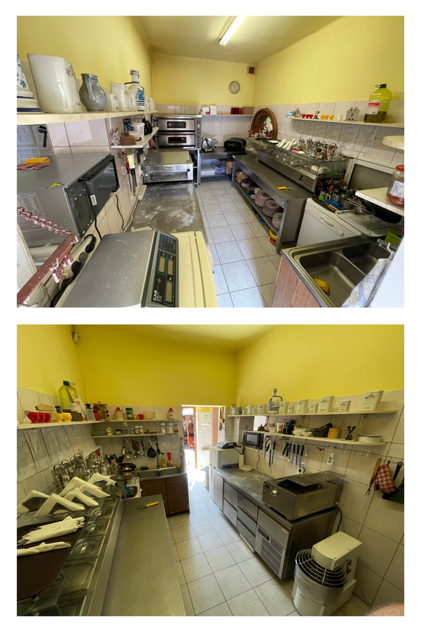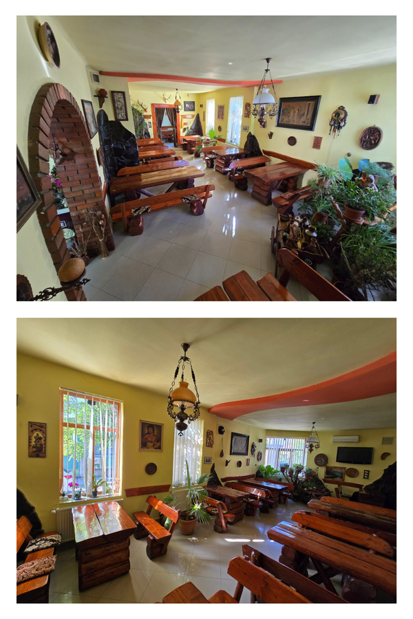 Restaurantul include o bucatarie profesionala complet utilata cu echipamente moderne (blaturi din otel inoxidabil, hote inox profesionale, cuptor pizza, plita si chiuveta), o zona de servire clienti amenajata cu mobilier rustic de calitate.