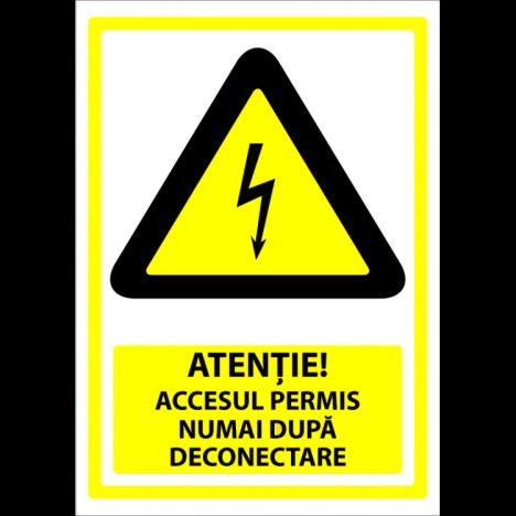 Vand Indicator atentie accesul permis numai dupa deconectare la un pret foarte avantajos! Indicator atentie accesul permis numai dupa deconectare Va putem oferi alte dimensiuni, materiale sau modele separat la cerere. Noua modalitate de print UV pentru semne si indicatoare este de ultima tehnologie UV . Aceasta tehnica este mult mai performanta decat o tehnica obisnuita de printare digitala. Atat calitatea sa net superioara, cat si versarilitatea sa pe imprimarea diferitelor produse este foarte mare si larga Un print UV consta intr-o tehnica de printare prin care cerneala se aplica pe un material sau obiect de imprimat, care este apoi uscata instant de catre un emitator de raze ultraviolet. Pentru a acoperi toata suprafata printata sunt utilizate numeroase tipuri de compusi, incluzand carbonatul de calciu si caolinitul. Aceasta imprimare UV este o maniera de imprimare digitala cu o tehnica noua care usuca cerneala. Se poate folosi pe o gama larga de materiale, astfel incat se poate imprima pe plastic, metal, hartie, carton, placi ceramice, sticla, lemn si multe altele. ? Autocolant industrial UV pentru semne si indicatoare ? Folie adeziva din PVC polimeric, utilizata in special la exterior, pentru decorarea suprafetelor drepte, etc; ? Grosimea este de 90 microni. ? Adezivul este pe baza de poliacrilat, permanent. ? pentru interior si exterior. ? Suprafata foliei este integral colorata, lucioasa (59 de culori) sau mata (56 culori). ? Placi forex industrial UV industrial pentru semne si indicatoare cu suprafata tare, lucioasa, bun izolator termic si fonic, rezistenta mare la agenti naturali si corozivi, flamabilitate redusa. ? Gama de culori disponibile in permanenta in stoc: rosu, albastru inchis, albastru deschis, negru, galben inchis, galben deschis, gri, verde. ? Placile din PVC compact industrial au suprafata dura si lucioasa. Se recomanda folosirea acestor placi atat pentru aplicatii indoor, cat si pentru aplicatii outdoor, datorita proprietatii materialului de a fi un bun izolator termic si fonic. Placile din PVC compact sunt vacuumabile si termoformabile. ? Grosimi disponibile in permanenta in stoc: 2mm; 3mm. ? Placi bond industrial uv pentru semne si indicatoare ? placi sandwich aluminiu cunoscute si sub denumirile comerciale de alucobond, alubond si dibond. ? Utilizate pentru placari fatade, placari interioare, placari exterioare. ? Este un material cu doua fete din aluminiu si un miez din polietilena ce inlocuieste cu succes tabla, lambriurile sau placajele plastice. ? Miezul este fixat prin aderenta pe fetele din tabla, pe toata suprafata. ? Tabla este vopsita in minim doua straturi, peste care se aplica un strat de lac protector compatibil cu vopseaua. ? Panourile pot avea o singura fata decor sau ambele fete colorate ? ? Placile sunt foarte usor de prelucrat, putand fi personalizate prin laminare, serigrafiere, tipar digital si lacuire, fiind usor de intretinut si avand o durata sporita de viata.. www.prevenirea.ro - 0724 306 714. Va rugam sa selectati dimensiunea potrivita pentru dvs.