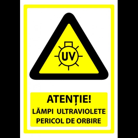 Vand Indicator atentie lampi ultraviolete pericol de orbire la un pret foarte avantajos! Indicator atentie lampi ultraviolete pericol de orbire Va putem oferi alte dimensiuni, materiale sau modele separat la cerere. Noua modalitate de print UV pentru semne si indicatoare este de ultima tehnologie UV . Aceasta tehnica este mult mai performanta decat o tehnica obisnuita de printare digitala. Atat calitatea sa net superioara, cat si versarilitatea sa pe imprimarea diferitelor produse este foarte mare si larga Un print UV consta intr-o tehnica de printare prin care cerneala se aplica pe un material sau obiect de imprimat, care este apoi uscata instant de catre un emitator de raze ultraviolet. Pentru a acoperi toata suprafata printata sunt utilizate numeroase tipuri de compusi, incluzand carbonatul de calciu si caolinitul. Aceasta imprimare UV este o maniera de imprimare digitala cu o tehnica noua care usuca cerneala. Se poate folosi pe o gama larga de materiale, astfel incat se poate imprima pe plastic, metal, hartie, carton, placi ceramice, sticla, lemn si multe altele. ? Autocolant industrial UV pentru semne si indicatoare ? Folie adeziva din PVC polimeric, utilizata in special la exterior, pentru decorarea suprafetelor drepte, etc; ? Grosimea este de 90 microni. ? Adezivul este pe baza de poliacrilat, permanent. ? pentru interior si exterior. ? Suprafata foliei este integral colorata, lucioasa (59 de culori) sau mata (56 culori). ? Placi forex industrial UV industrial pentru semne si indicatoare cu suprafata tare, lucioasa, bun izolator termic si fonic, rezistenta mare la agenti naturali si corozivi, flamabilitate redusa. ? Gama de culori disponibile in permanenta in stoc: rosu, albastru inchis, albastru deschis, negru, galben inchis, galben deschis, gri, verde. ? Placile din PVC compact industrial au suprafata dura si lucioasa. Se recomanda folosirea acestor placi atat pentru aplicatii indoor, cat si pentru aplicatii outdoor, datorita proprietatii materialului de a fi un bun izolator termic si fonic. Placile din PVC compact sunt vacuumabile si termoformabile. ? Grosimi disponibile in permanenta in stoc: 2mm; 3mm. ? Placi bond industrial uv pentru semne si indicatoare ? placi sandwich aluminiu cunoscute si sub denumirile comerciale de alucobond, alubond si dibond. ? Utilizate pentru placari fatade, placari interioare, placari exterioare. ? Este un material cu doua fete din aluminiu si un miez din polietilena ce inlocuieste cu succes tabla, lambriurile sau placajele plastice. ? Miezul este fixat prin aderenta pe fetele din tabla, pe toata suprafata. ? Tabla este vopsita in minim doua straturi, peste care se aplica un strat de lac protector compatibil cu vopseaua. ? Panourile pot avea o singura fata decor sau ambele fete colorate ? ? Placile sunt foarte usor de prelucrat, putand fi personalizate prin laminare, serigrafiere, tipar digital si lacuire, fiind usor de intretinut si avand o durata sporita de viata.. www.prevenirea.ro - 0724 306 714. Va rugam sa selectati dimensiunea potrivita pentru dvs.