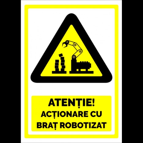 Vand Indicator pentru actionare cu brat robotizat la un pret foarte avantajos! Indicator pentru actionare cu brat robotizat Va putem oferi alte dimensiuni, materiale sau modele separat la cerere. Noua modalitate de print UV pentru semne si indicatoare este de ultima tehnologie UV . Aceasta tehnica este mult mai performanta decat o tehnica obisnuita de printare digitala. Atat calitatea sa net superioara, cat si versarilitatea sa pe imprimarea diferitelor produse este foarte mare si larga Un print UV consta intr-o tehnica de printare prin care cerneala se aplica pe un material sau obiect de imprimat, care este apoi uscata instant de catre un emitator de raze ultraviolet. Pentru a acoperi toata suprafata printata sunt utilizate numeroase tipuri de compusi, incluzand carbonatul de calciu si caolinitul. Aceasta imprimare UV este o maniera de imprimare digitala cu o tehnica noua care usuca cerneala. Se poate folosi pe o gama larga de materiale, astfel incat se poate imprima pe plastic, metal, hartie, carton, placi ceramice, sticla, lemn si multe altele. ? Autocolant industrial UV pentru semne si indicatoare ? Folie adeziva din PVC polimeric, utilizata in special la exterior, pentru decorarea suprafetelor drepte, etc; ? Grosimea este de 90 microni. ? Adezivul este pe baza de poliacrilat, permanent. ? pentru interior si exterior. ? Suprafata foliei este integral colorata, lucioasa (59 de culori) sau mata (56 culori). ? Placi forex industrial UV industrial pentru semne si indicatoare cu suprafata tare, lucioasa, bun izolator termic si fonic, rezistenta mare la agenti naturali si corozivi, flamabilitate redusa. ? Gama de culori disponibile in permanenta in stoc: rosu, albastru inchis, albastru deschis, negru, galben inchis, galben deschis, gri, verde. ? Placile din PVC compact industrial au suprafata dura si lucioasa. Se recomanda folosirea acestor placi atat pentru aplicatii indoor, cat si pentru aplicatii outdoor, datorita proprietatii materialului de a fi un bun izolator termic si fonic. Placile din PVC compact sunt vacuumabile si termoformabile. ? Grosimi disponibile in permanenta in stoc: 2mm; 3mm. ? Placi bond industrial uv pentru semne si indicatoare ? placi sandwich aluminiu cunoscute si sub denumirile comerciale de alucobond, alubond si dibond. ? Utilizate pentru placari fatade, placari interioare, placari exterioare. ? Este un material cu doua fete din aluminiu si un miez din polietilena ce inlocuieste cu succes tabla, lambriurile sau placajele plastice. ? Miezul este fixat prin aderenta pe fetele din tabla, pe toata suprafata. ? Tabla este vopsita in minim doua straturi, peste care se aplica un strat de lac protector compatibil cu vopseaua. ? Panourile pot avea o singura fata decor sau ambele fete colorate ? ? Placile sunt foarte usor de prelucrat, putand fi personalizate prin laminare, serigrafiere, tipar digital si lacuire, fiind usor de intretinut si avand o durata sporita de viata.. www.prevenirea.ro - 0724 306 714. Va rugam sa selectati dimensiunea potrivita pentru dvs.