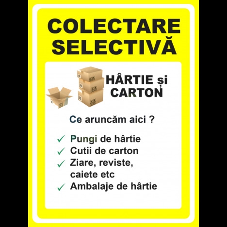Vand Indicator pentru colectare selectiva hartie si carton la un pret foarte avantajos! Indicator pentru colectare selectiva hartie si carton Va putem oferi alte dimensiuni, materiale sau modele separat la cerere. Noua modalitate de print UV pentru semne si indicatoare este de ultima tehnologiev UV . Aceasta tehnica este mult mai performanta decat o tehnica obisnuita de printare digitala. Atat calitatea sa net superioara, cat si versarilitatea sa pe imprimarea diferitelor produse este foarte mare si larga Un print UV consta intr-o tehnica de printare prin care cerneala se aplica pe un material sau obiect de imprimat, care este apoi uscata instant de catre un emitator de raze ultraviolet. Pentru a acoperi toata suprafata printata sunt utilizate numeroase tipuri de compusi, incluzand carbonatul de calciu si caolinitul. Aceasta imprimare UV este o maniera de imprimare digitala cu o tehnica noua care usuca cerneala. Se poate folosi pe o gama larga de materiale, astfel incat se poate imprima pe plastic, metal, hartie, carton, placi ceramice, sticla, lemn si multe altele. ? Autocolant industrial UV pentru semne si indicatoare ? Folie adeziva din PVC polimeric, utilizata in special la exterior, pentru decorarea suprafetelor drepte, etc; ? Grosimea este de 90 microni. ? Adezivul este pe baza de poliacrilat, permanent. ? pentru interior si exterior. ? Suprafata foliei este integral colorata, lucioasa (59 de culori) sau mata (56 culori). ? Placi forex industrial UV industrial pentru semne si indicatoare cu suprafata tare, lucioasa, bun izolator termic si fonic, rezistenta mare la agenti naturali si corozivi, flamabilitate redusa. ? Gama de culori disponibile in permanenta in stoc: rosu, albastru inchis, albastru deschis, negru, galben inchis, galben deschis, gri, verde. ? Placile din PVC compact industrial au suprafata dura si lucioasa. Se recomanda folosirea acestor placi atat pentru aplicatii indoor, cat si pentru aplicatii outdoor, datorita proprietatii materialului de a fi un bun izolator termic si fonic. Placile din PVC compact sunt vacuumabile si termoformabile. ? Grosimi disponibile in permanenta in stoc: 2mm; 3mm. ? Placi bond industrial uv pentru semne si indicatoare ? placi sandwich aluminiu cunoscute si sub denumirile comerciale de alucobond, alubond si dibond. ? Utilizate pentru placari fatade, placari interioare, placari exterioare. ? Este un material cu doua fete din aluminiu si un miez din polietilena ce inlocuieste cu succes tabla, lambriurile sau placajele plastice. ? Miezul este fixat prin aderenta pe fetele din tabla, pe toata suprafata. ? Tabla este vopsita in minim doua straturi, peste care se aplica un strat de lac protector compatibil cu vopseaua. ? Panourile pot avea o singura fata decor sau ambele fete colorate ? ? Placile sunt foarte usor de prelucrat, putand fi personalizate prin laminare, serigrafiere, tipar digital si lacuire, fiind usor de intretinut si avand o durata sporita de viata.. www.prevenirea.ro - 0724 306 714. Va rugam sa selectati dimensiunea potrivita pentru dvs