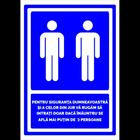 Vand Indicator Pentru Siguranta Dumneavoastra Si A Celor Din Jur Va Rugam Sa Intrati Doar Daca Inauntru Se Afla Mai Putin de 2 Persoane la un pret foarte avantajos! Indicator Pentru Siguranta Dumneavoastra Si A Celor Din Jur Va Rugam Sa Intrati Doar Daca Inauntru Se Afla Mai Putin de 2 Persoane Va putem oferi alte dimensiuni, materiale sau modele separat la cerere. Noua modalitate de print UV pentru semne si indicatoare este de ultima tehnologiev UV . Aceasta tehnica este mult mai performanta decat o tehnica obisnuita de printare digitala. Atat calitatea sa net superioara, cat si versarilitatea sa pe imprimarea diferitelor produse este foarte mare si larga Un print UV consta intr-o tehnica de printare prin care cerneala se aplica pe un material sau obiect de imprimat, care este apoi uscata instant de catre un emitator de raze ultraviolet. Pentru a acoperi toata suprafata printata sunt utilizate numeroase tipuri de compusi, incluzand carbonatul de calciu si caolinitul. Aceasta imprimare UV este o maniera de imprimare digitala cu o tehnica noua care usuca cerneala. Se poate folosi pe o gama larga de materiale, astfel incat se poate imprima pe plastic, metal, hartie, carton, placi ceramice, sticla, lemn si multe altele. ? Autocolant industrial UV pentru semne si indicatoare ? Folie adeziva din PVC polimeric, utilizata in special la exterior, pentru decorarea suprafetelor drepte, etc; ? Grosimea este de 90 microni. ? Adezivul este pe baza de poliacrilat, permanent. ? pentru interior si exterior. ? Suprafata foliei este integral colorata, lucioasa (59 de culori) sau mata (56 culori). ? Placi forex industrial UV industrial pentru semne si indicatoare cu suprafata tare, lucioasa, bun izolator termic si fonic, rezistenta mare la agenti naturali si corozivi, flamabilitate redusa. ? Gama de culori disponibile in permanenta in stoc: rosu, albastru inchis, albastru deschis, negru, galben inchis, galben deschis, gri, verde. ? Placile din PVC compact industrial au suprafata dura si lucioasa. Se recomanda folosirea acestor placi atat pentru aplicatii indoor, cat si pentru aplicatii outdoor, datorita proprietatii materialului de a fi un bun izolator termic si fonic. Placile din PVC compact sunt vacuumabile si termoformabile. ? Grosimi disponibile in permanenta in stoc: 2mm; 3mm. ? Placi bond industrial uv pentru semne si indicatoare ? placi sandwich aluminiu cunoscute si sub denumirile comerciale de alucobond, alubond si dibond. ? Utilizate pentru placari fatade, placari interioare, placari exterioare. ? Este un material cu doua fete din aluminiu si un miez din polietilena ce inlocuieste cu succes tabla, lambriurile sau placajele plastice. ? Miezul este fixat prin aderenta pe fetele din tabla, pe toata suprafata. ? Tabla este vopsita in minim doua straturi, peste care se aplica un strat de lac protector compatibil cu vopseaua. ? Panourile pot avea o singura fata decor sau ambele fete colorate ? ? Placile sunt foarte usor de prelucrat, putand fi personalizate prin laminare, serigrafiere, tipar digital si lacuire, fiind usor de intretinut si avand o durata sporita de viata.. www.prevenirea.ro - 0724 306 714. Va rugam sa selectati dimensiunea potrivita pentru dvs