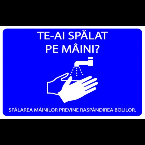 Vand indicator pentru spalarea mainilor previne raspandirea bolilor la un pret foarte avantajos! indicator pentru spalarea mainilor previne raspandirea bolilor Va putem oferi alte dimensiuni, materiale sau modele separat la cerere. Noua modalitate de print UV pentru semne si indicatoare este de ultima tehnologiev UV . Aceasta tehnica este mult mai performanta decat o tehnica obisnuita de printare digitala. Atat calitatea sa net superioara, cat si versarilitatea sa pe imprimarea diferitelor produse este foarte mare si larga Un print UV consta intr-o tehnica de printare prin care cerneala se aplica pe un material sau obiect de imprimat, care este apoi uscata instant de catre un emitator de raze ultraviolet. Pentru a acoperi toata suprafata printata sunt utilizate numeroase tipuri de compusi, incluzand carbonatul de calciu si caolinitul. Aceasta imprimare UV este o maniera de imprimare digitala cu o tehnica noua care usuca cerneala. Se poate folosi pe o gama larga de materiale, astfel incat se poate imprima pe plastic, metal, hartie, carton, placi ceramice, sticla, lemn si multe altele. ? Autocolant industrial UV pentru semne si indicatoare ? Folie adeziva din PVC polimeric, utilizata in special la exterior, pentru decorarea suprafetelor drepte, etc; ? Grosimea este de 90 microni. ? Adezivul este pe baza de poliacrilat, permanent. ? pentru interior si exterior. ? Suprafata foliei este integral colorata, lucioasa (59 de culori) sau mata (56 culori). ? Placi forex industrial UV industrial pentru semne si indicatoare cu suprafata tare, lucioasa, bun izolator termic si fonic, rezistenta mare la agenti naturali si corozivi, flamabilitate redusa. ? Gama de culori disponibile in permanenta in stoc: rosu, albastru inchis, albastru deschis, negru, galben inchis, galben deschis, gri, verde. ? Placile din PVC compact industrial au suprafata dura si lucioasa. Se recomanda folosirea acestor placi atat pentru aplicatii indoor, cat si pentru aplicatii outdoor, datorita proprietatii materialului de a fi un bun izolator termic si fonic. Placile din PVC compact sunt vacuumabile si termoformabile. ? Grosimi disponibile in permanenta in stoc: 2mm; 3mm. ? Placi bond industrial uv pentru semne si indicatoare ? placi sandwich aluminiu cunoscute si sub denumirile comerciale de alucobond, alubond si dibond. ? Utilizate pentru placari fatade, placari interioare, placari exterioare. ? Este un material cu doua fete din aluminiu si un miez din polietilena ce inlocuieste cu succes tabla, lambriurile sau placajele plastice. ? Miezul este fixat prin aderenta pe fetele din tabla, pe toata suprafata. ? Tabla este vopsita in minim doua straturi, peste care se aplica un strat de lac protector compatibil cu vopseaua. ? Panourile pot avea o singura fata decor sau ambele fete colorate ? ? Placile sunt foarte usor de prelucrat, putand fi personalizate prin laminare, serigrafiere, tipar digital si lacuire, fiind usor de intretinut si avand o durata sporita de viata.. www.prevenirea.ro - 0724 306 714. Va rugam sa selectati dimensiunea potrivita pentru dv