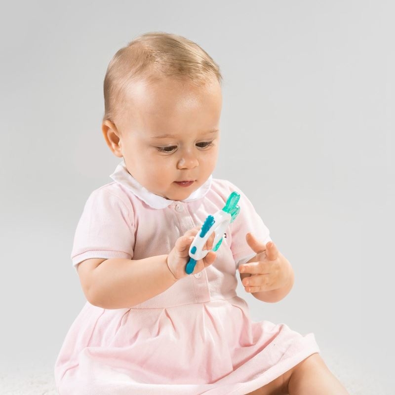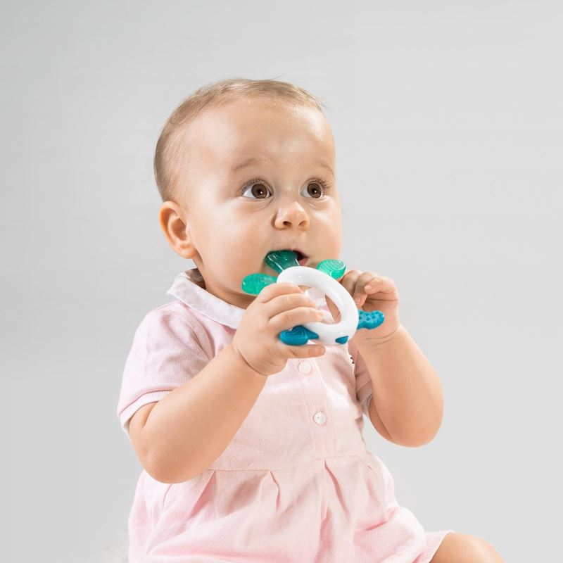 Inel de dentitie in forma de broasca testoasa, cu structura texturata si elemente umplute cu apa distilata, ce calmeaza si ofera o senzatie de confort bebelusului cand primii dintisori de lapte sunt gata sa iasa. Poate fi racit in frigider pentru a oferi o senzatie placuta, calmanta, pentru mai mult timp. Jucaria pentru dentitie este usoara, rezistenta la uzura si este usor de tinut in manuta copilului. Nu contine substante nocive, fara BPA si fara ftalati. Este recomandat pentru bebelusi de peste 3 luni.