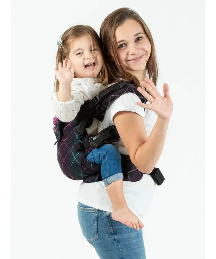 Ulterior, cu ajutorul a doua seat transformers, baza sezutului copilasului se poate mari atat de mult incat sa fie potrivita purtarii chiar si a unui prescolar inalt, mentinand pozitia ergonomica.