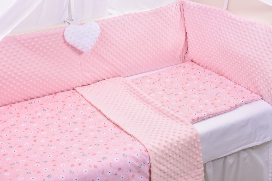 Lenjerie 3 piese patut 120x60 cm model floricele si plus minky roz