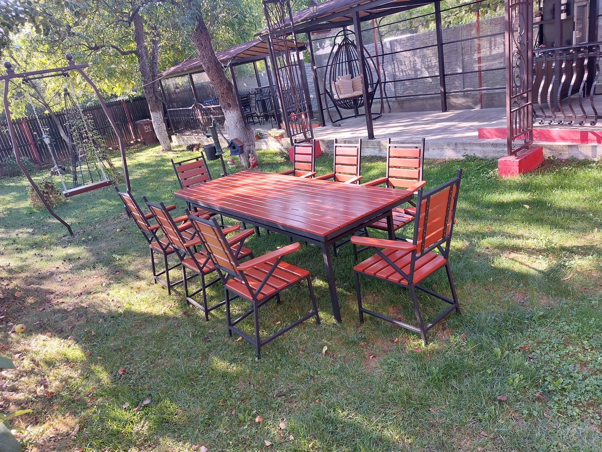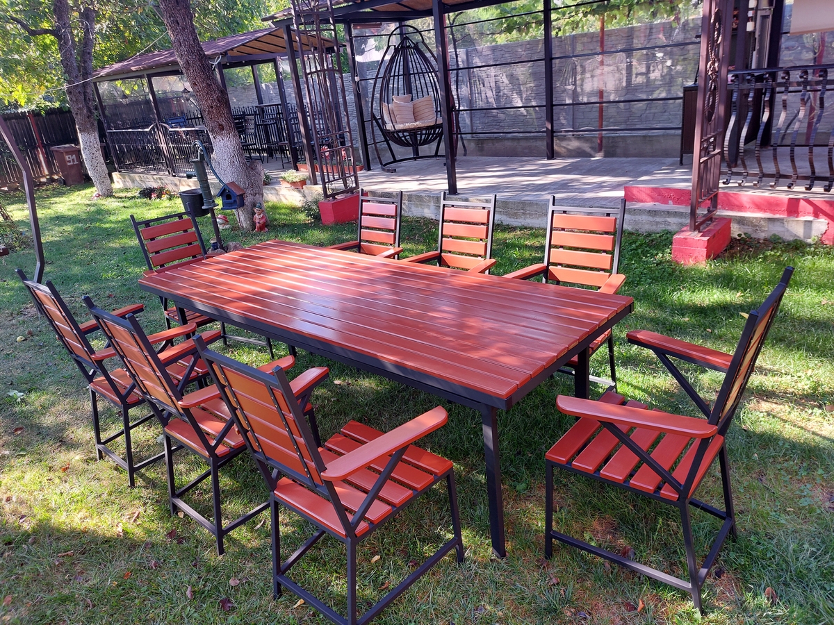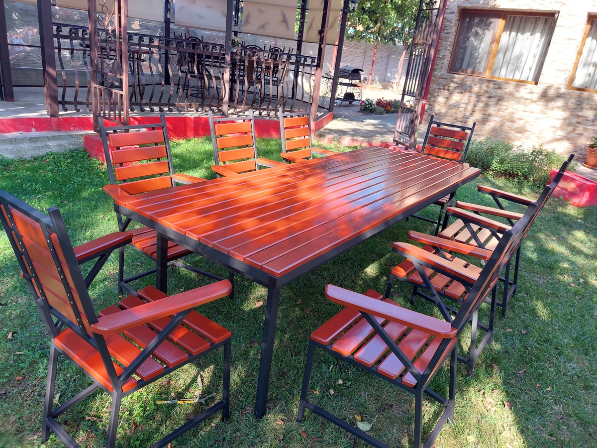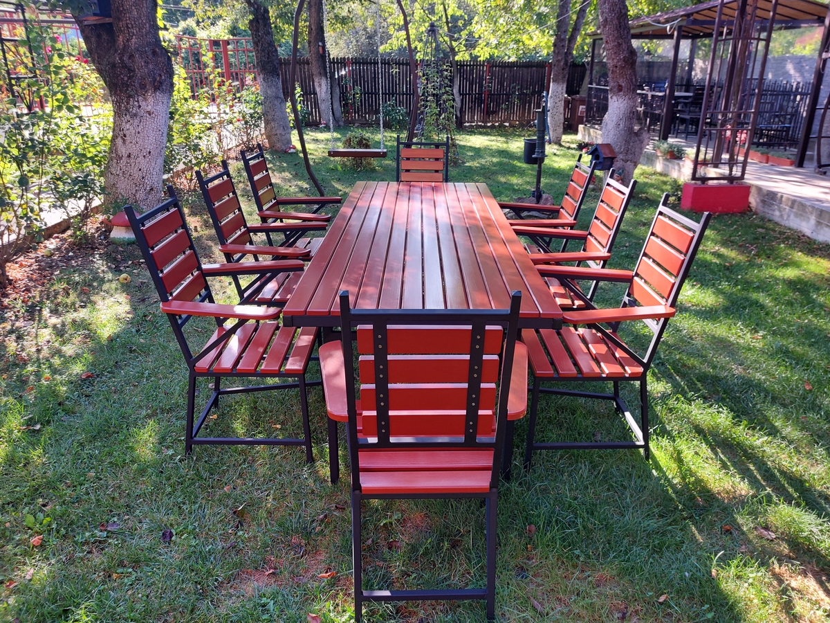 Masa (2400×900mm) si 8 scaune cu cotiere, fier negru, lemn maro roscat.