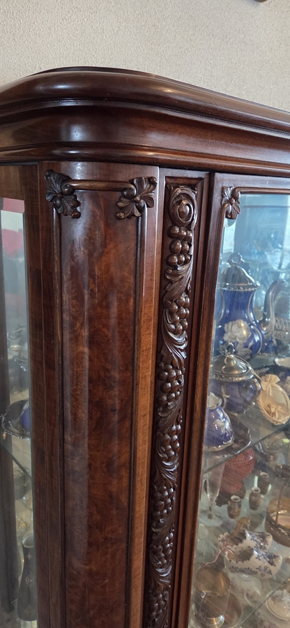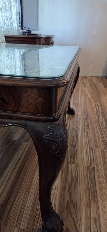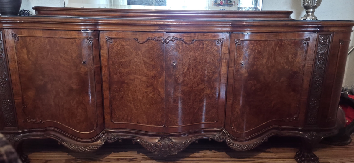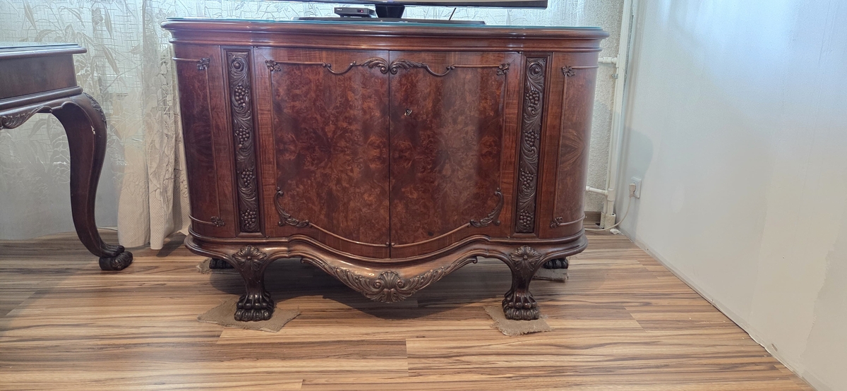 Mobila lemn cires, cuprinde vitrina, doua servante , una cu doua usi, una cu patru usi, masa si scaune. Scaunele necesita reparatii.