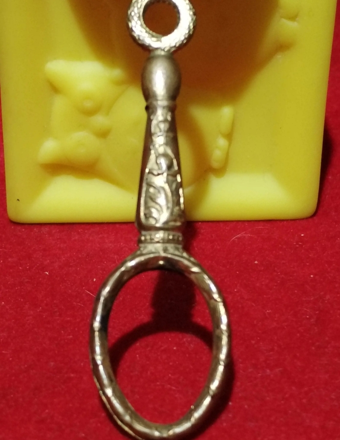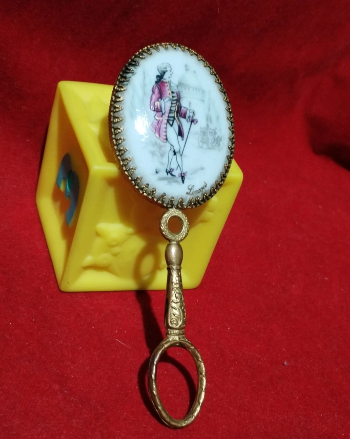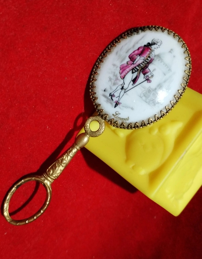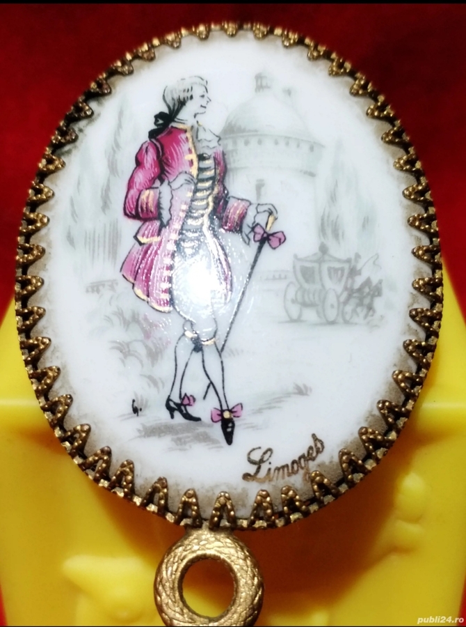 Oglinda de poseta Limoges, anii 1960, din portelan pictat manual cu scena Rococo tip Fragonard, inramata cu cadru metalic aurit din alama bronzina si maner decorativ floral.