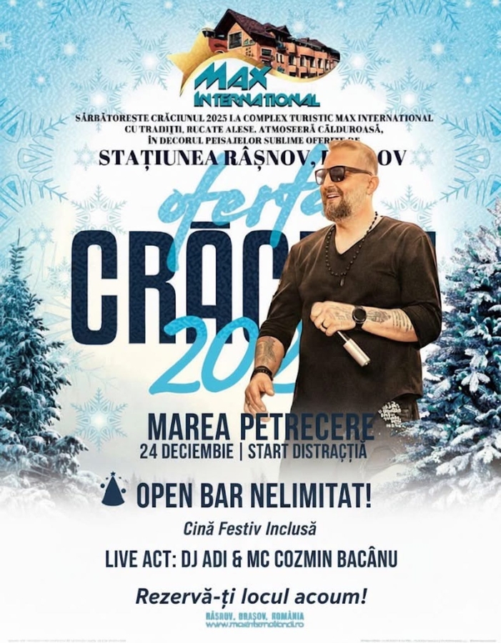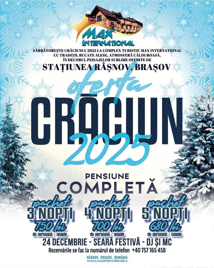 Complex Turistic Max International va invita sa petreceti un Craciun de poveste in inima Rasnovului, Judetul Brasov. Suntem un Hotel de 3 Stele unde veti gasi totul intr-un singur loc, perfect pentru un sejur fara griji.