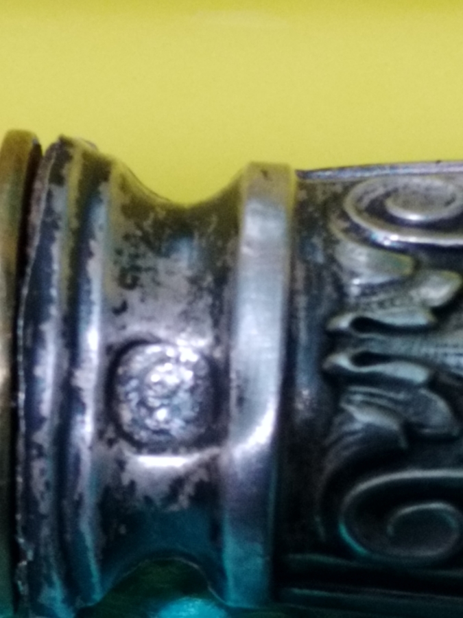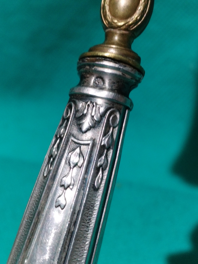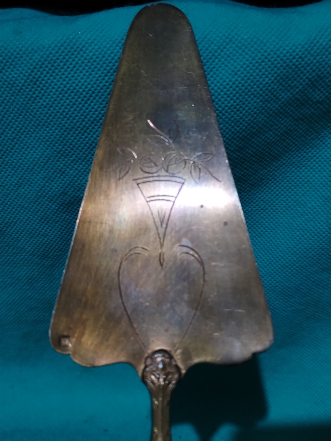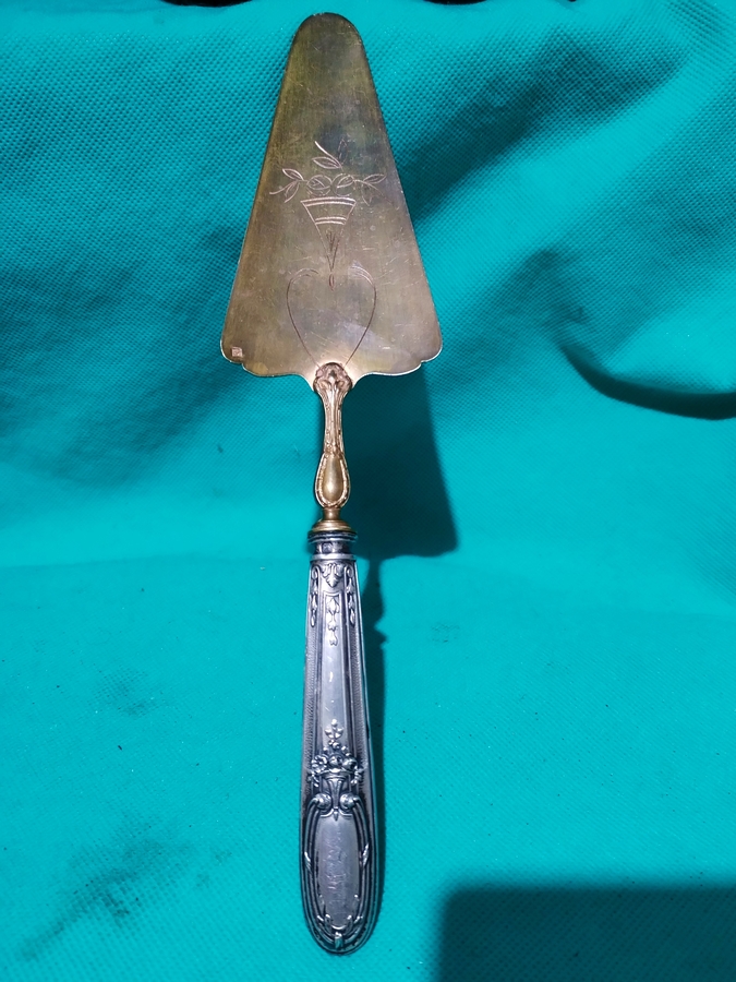 Paleta franceza pentru tort/ prajituri, cu maner din argint 950, stanta Minerva si paleta din alama gravata, realizata in stilul perioadei Belle Epoque, a anilor 1900.
