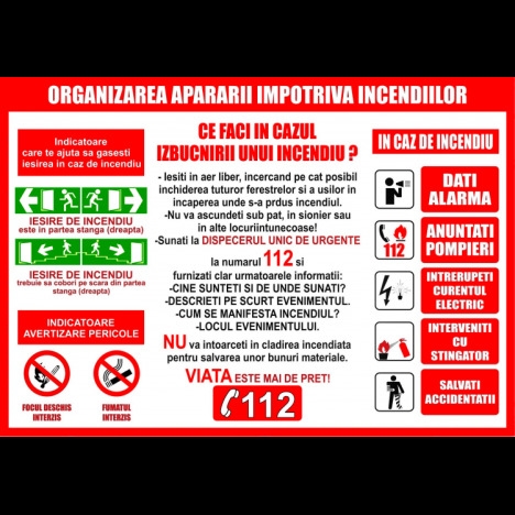 Vand Panou pentru organizarea apararii impotriva incendiilor la un pret foarte avantajos! Panou pentru organizarea apararii impotriva incendiilor Va putem oferi alte dimensiuni, materiale sau modele separat la cerere. Noua modalitate de print UV pentru semne si indicatoare este de ultima tehnologie UV . Aceasta tehnica este mult mai performanta decat o tehnica obisnuita de printare digitala. Atat calitatea sa net superioara, cat si versarilitatea sa pe imprimarea diferitelor produse este foarte mare si larga Un print UV consta intr-o tehnica de printare prin care cerneala se aplica pe un material sau obiect de imprimat, care este apoi uscata instant de catre un emitator de raze ultraviolet. Pentru a acoperi toata suprafata printata sunt utilizate numeroase tipuri de compusi, incluzand carbonatul de calciu si caolinitul. Aceasta imprimare UV este o maniera de imprimare digitala cu o tehnica noua care usuca cerneala. Se poate folosi pe o gama larga de materiale, astfel incat se poate imprima pe plastic, metal, hartie, carton, placi ceramice, sticla, lemn si multe altele. ? Autocolant industrial UV pentru semne si indicatoare ? Folie adeziva din PVC polimeric, utilizata in special la exterior, pentru decorarea suprafetelor drepte, etc; ? Grosimea este de 90 microni. ? Adezivul este pe baza de poliacrilat, permanent. ? pentru interior si exterior. ? Suprafata foliei este integral colorata, lucioasa (59 de culori) sau mata (56 culori). ? Placi forex industrial UV industrial pentru semne si indicatoare cu suprafata tare, lucioasa, bun izolator termic si fonic, rezistenta mare la agenti naturali si corozivi, flamabilitate redusa. ? Gama de culori disponibile in permanenta in stoc: rosu, albastru inchis, albastru deschis, negru, galben inchis, galben deschis, gri, verde. ? Placile din PVC compact industrial au suprafata dura si lucioasa. Se recomanda folosirea acestor placi atat pentru aplicatii indoor, cat si pentru aplicatii outdoor, datorita proprietatii materialului de a fi un bun izolator termic si fonic. Placile din PVC compact sunt vacuumabile si termoformabile. ? Grosimi disponibile in permanenta in stoc: 2mm; 3mm. ? Placi bond industrial uv pentru semne si indicatoare ? placi sandwich aluminiu cunoscute si sub denumirile comerciale de alucobond, alubond si dibond. ? Utilizate pentru placari fatade, placari interioare, placari exterioare. ? Este un material cu doua fete din aluminiu si un miez din polietilena ce inlocuieste cu succes tabla, lambriurile sau placajele plastice. ? Miezul este fixat prin aderenta pe fetele din tabla, pe toata suprafata. ? Tabla este vopsita in minim doua straturi, peste care se aplica un strat de lac protector compatibil cu vopseaua. ? Panourile pot avea o singura fata decor sau ambele fete colorate ? ? Placile sunt foarte usor de prelucrat, putand fi personalizate prin laminare, serigrafiere, tipar digital si lacuire, fiind usor de intretinut si avand o durata sporita de viata.. www.prevenirea.ro - 0724 306 714. Va rugam sa selectati dimensiunea potrivita pentru dvs.