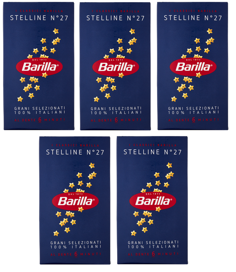Un clasic in lumea pastelor care pot fi savurate in bulion, Barilla Stelline sunt mici vedete cu o gaura in mijloc care au starnit mereu curiozitatea si pofta celor mici. Aceste paste practice, care se gatesc rapid, au fost concepute pentru a stimula imaginatia celor mici si a-i introduce in lumea delicioasa a pastelor. Ideal cu: toate tipurile de supe, de la cele mai simple cu piure de legume la cele mai elaborate, imbogatite cu ingrediente rafinate. Grau dur italian atent selectat. O mare atentie de-a lungul lantului de aprovizionare pentru a asigura intotdeauna un nivel ridicat de calitate si siguranta alimentara. O textura care este intotdeauna al dente.