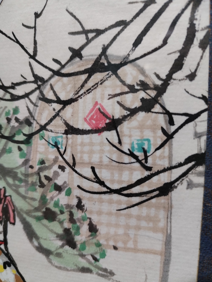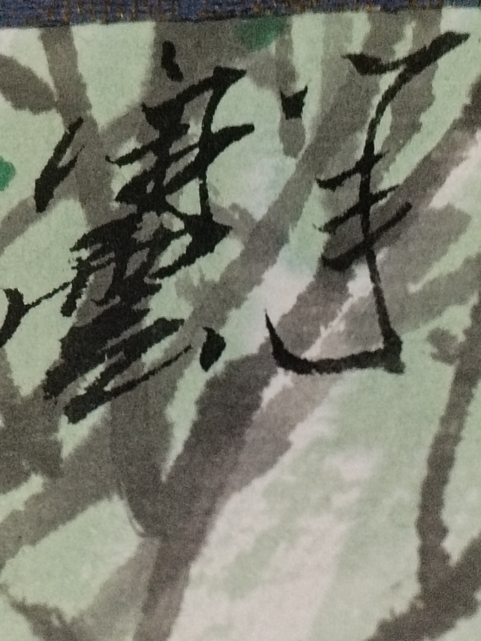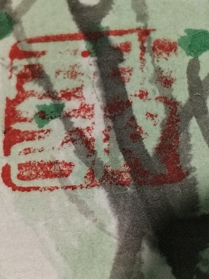 Pictura poarta o semnatura caligrafica si un sigiliu rosu traditional aplicat manual, asa cum se face in pictura autentica asiatica, pentru a certifica autorul si atelierul de unde provine lucrarea.