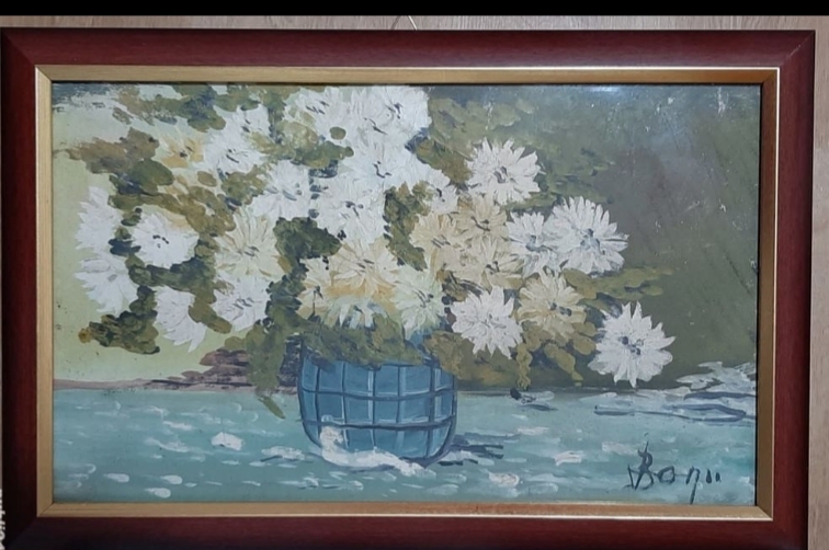 Pictura vaza cu flori albe,^ 26cm x 42cm, realizata cu nuante proaspete si sugestive in ulei pe panza.