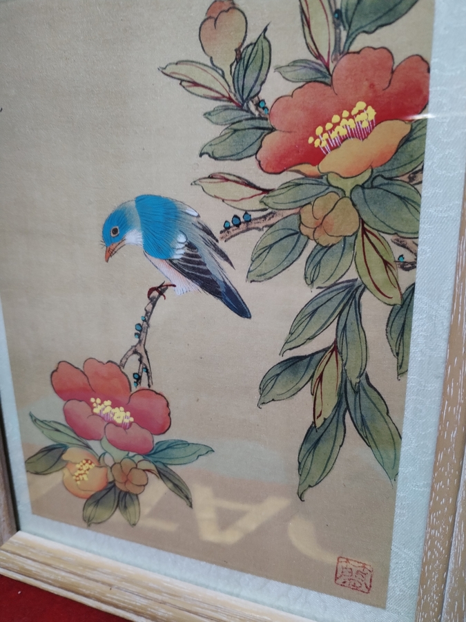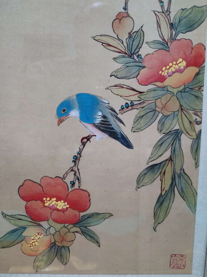 Pictura manuala veche chinezeasca stil gongbi, cu sigiliu pe panza de matase, anii 1950-1970.