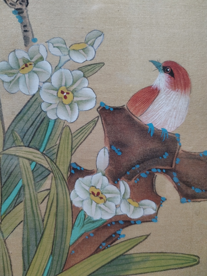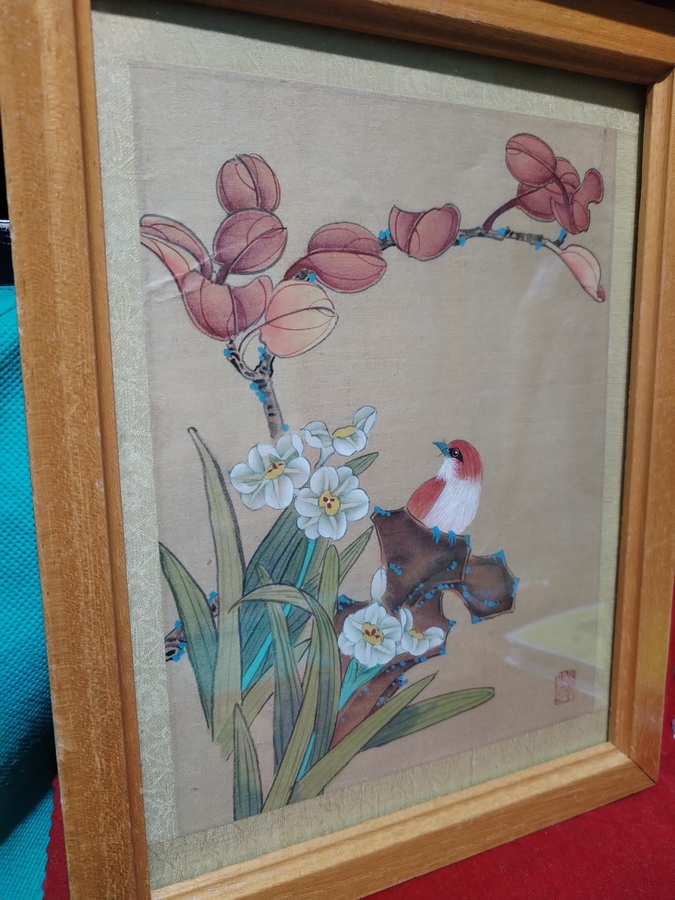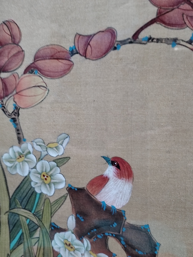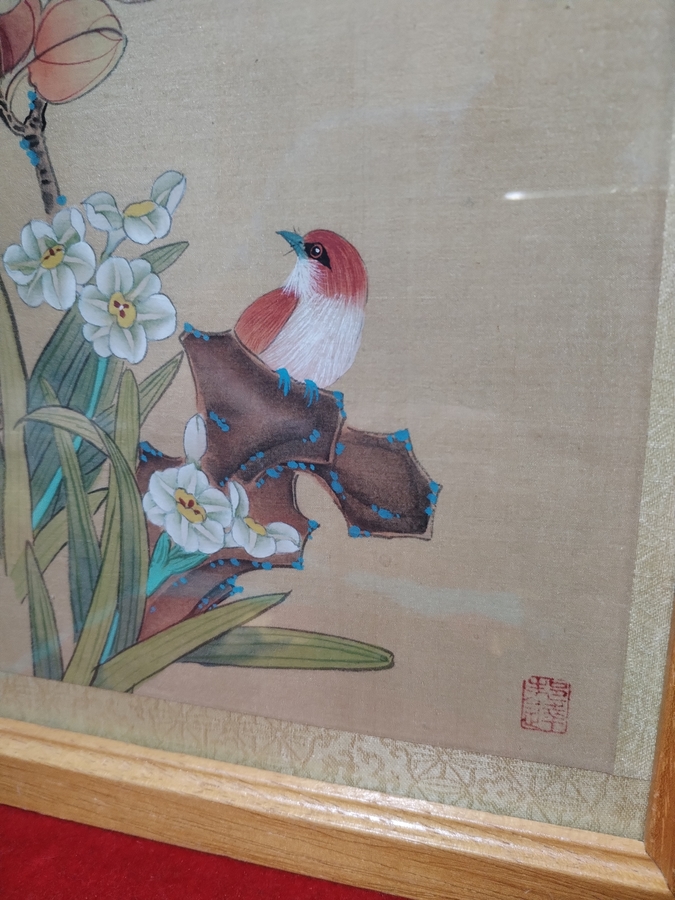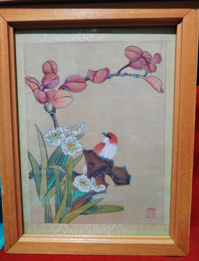 Pictura manuala veche chinezeasca stil gongbi, cu sigiliu pe panza de matase, anii 1950-1970.
