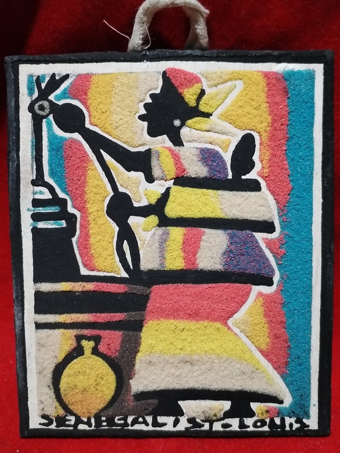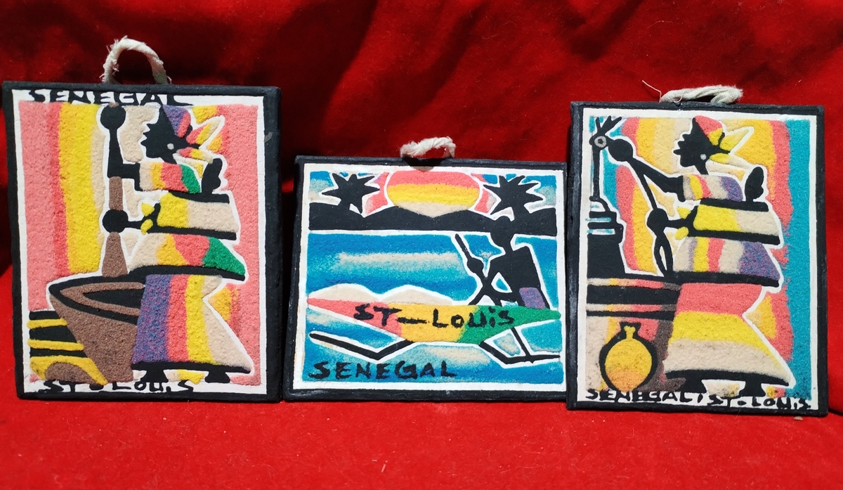 Trei picturi traditionale Senegaleze, realizate pe nisip de plaja oceanic lipit pe lemn.