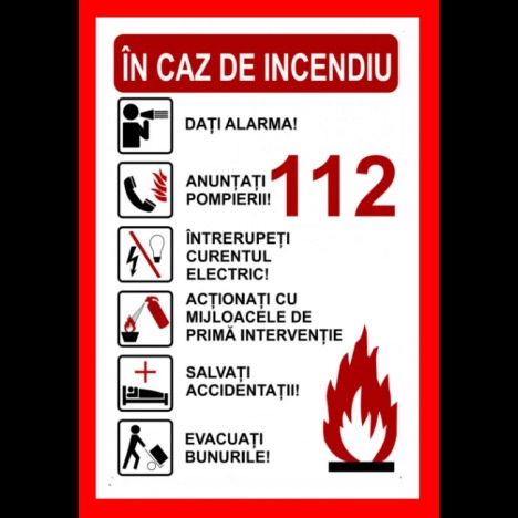 Vand Placuta 112 in caz de incendiu la un pret foarte avantajos! Placuta 112 in caz de incendiu Va putem oferi si alte dimensiuni, materiale sau modele separat la cerere. Noua modalitate de imprimare UV pentru semne si indicatoare este cea mai recenta tehnologie UV. Aceasta tehnica este mult mai eficienta decat o tehnica obisnuita de imprimare digitala. Atat calitatea sa net superioara, cat si versatilitatea sa la imprimarea diferitelor produse sunt foarte mari si largi O imprimare UV consta intr-o tehnica de imprimare prin care cerneala este aplicata pe un material sau obiect care urmeaza sa fie imprimat, care este apoi uscata instantaneu de un emitator de raze ultraviolete. Multe tipuri de compusi sunt folosite pentru a acoperi intreaga suprafata imprimata, inclusiv carbonat de calciu si caolinit. Aceasta imprimare UV este o metoda de imprimare digitala cu o noua tehnica care usuca cerneala. Poate fi folosit pe o gama larga de materiale, astfel incat poate imprima pe plastic, metal, hartie, carton, placi ceramice, sticla, lemn si multe altele. Disponibil: - Autocolant PVC - forex industrial - Dibond din aluminiu. - www.prevenirea.ro Telefon : 0724 30 67 14
