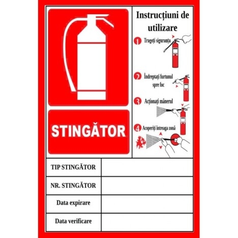 Vand Placuta cu instructiuni de utilizare stingatoare la un pret foarte avantajos! Placuta cu instructiuni de utilizare stingatoare Va putem oferi si alte dimensiuni, materiale sau modele separat la cerere. Noua modalitate de imprimare UV pentru semne si indicatoare este cea mai recenta tehnologie UV. Aceasta tehnica este mult mai eficienta decat o tehnica obisnuita de imprimare digitala. Atat calitatea sa net superioara, cat si versatilitatea sa la imprimarea diferitelor produse sunt foarte mari si largi O imprimare UV consta intr-o tehnica de imprimare prin care cerneala este aplicata pe un material sau obiect care urmeaza sa fie imprimat, care este apoi uscata instantaneu de un emitator de raze ultraviolete. Multe tipuri de compusi sunt folosite pentru a acoperi intreaga suprafata imprimata, inclusiv carbonat de calciu si caolinit. Aceasta imprimare UV este o metoda de imprimare digitala cu o noua tehnica care usuca cerneala. Poate fi folosit pe o gama larga de materiale, astfel incat poate imprima pe plastic, metal, hartie, carton, placi ceramice, sticla, lemn si multe altele. Disponibil: - Autocolant PVC - forex industrial - Dibond din aluminiu. - www.prevenirea.ro Telefon : 0724 30 67 14