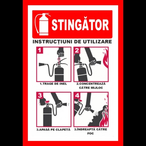 Vand Placuta cum sa folosesti stingatorul la un pret foarte avantajos! Placuta cum sa folosesti stingatorul Va putem oferi si alte dimensiuni, materiale sau modele separat la cerere. Noua modalitate de imprimare UV pentru semne si indicatoare este cea mai recenta tehnologie UV. Aceasta tehnica este mult mai eficienta decat o tehnica obisnuita de imprimare digitala. Atat calitatea sa net superioara, cat si versatilitatea sa la imprimarea diferitelor produse sunt foarte mari si largi O imprimare UV consta intr-o tehnica de imprimare prin care cerneala este aplicata pe un material sau obiect care urmeaza sa fie imprimat, care este apoi uscata instantaneu de un emitator de raze ultraviolete. Multe tipuri de compusi sunt folosite pentru a acoperi intreaga suprafata imprimata, inclusiv carbonat de calciu si caolinit. Aceasta imprimare UV este o metoda de imprimare digitala cu o noua tehnica care usuca cerneala. Poate fi folosit pe o gama larga de materiale, astfel incat poate imprima pe plastic, metal, hartie, carton, placi ceramice, sticla, lemn si multe altele. Disponibil: - Autocolant PVC - forex industrial - Dibond din aluminiu. - www.prevenirea.ro Telefon : 0724 30 67 14