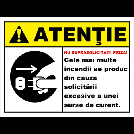 Vand Placuta nu suprasolicitati priza poate produce un incendiu la un pret foarte avantajos! Placuta nu suprasolicitati priza poate produce un incendiu Va putem oferi si alte dimensiuni, materiale sau modele separat la cerere. Noua modalitate de imprimare UV pentru semne si indicatoare este cea mai recenta tehnologie UV. Aceasta tehnica este mult mai eficienta decat o tehnica obisnuita de imprimare digitala. Atat calitatea sa net superioara, cat si versatilitatea sa la imprimarea diferitelor produse sunt foarte mari si largi O imprimare UV consta intr-o tehnica de imprimare prin care cerneala este aplicata pe un material sau obiect care urmeaza sa fie imprimat, care este apoi uscata instantaneu de un emitator de raze ultraviolete. Multe tipuri de compusi sunt folosite pentru a acoperi intreaga suprafata imprimata, inclusiv carbonat de calciu si caolinit. Aceasta imprimare UV este o metoda de imprimare digitala cu o noua tehnica care usuca cerneala. Poate fi folosit pe o gama larga de materiale, astfel incat poate imprima pe plastic, metal, hartie, carton, placi ceramice, sticla, lemn si multe altele. Disponibil: - Autocolant PVC - forex industrial - Dibond din aluminiu. - www.prevenirea.ro Telefon : 0724 306 714