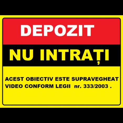 Vand Placuta pentru depozit nu intrati obiectiv video la un pret foarte avantajos! Placuta pentru depozit nu intrati obiectiv video Va putem oferi si alte dimensiuni, materiale sau modele separat la cerere. Noua modalitate de imprimare UV pentru semne si indicatoare este cea mai recenta tehnologie UV. Aceasta tehnica este mult mai eficienta decat o tehnica obisnuita de imprimare digitala. Atat calitatea sa net superioara, cat si versatilitatea sa la imprimarea diferitelor produse sunt foarte mari si largi O imprimare UV consta intr-o tehnica de imprimare prin care cerneala este aplicata pe un material sau obiect care urmeaza sa fie imprimat, care este apoi uscata instantaneu de un emitator de raze ultraviolete. Multe tipuri de compusi sunt folosite pentru a acoperi intreaga suprafata imprimata, inclusiv carbonat de calciu si caolinit. Aceasta imprimare UV este o metoda de imprimare digitala cu o noua tehnica care usuca cerneala. Poate fi folosit pe o gama larga de materiale, astfel incat poate imprima pe plastic, metal, hartie, carton, placi ceramice, sticla, lemn si multe altele. Disponibil: - Autocolant PVC - forex industrial - Dibond din aluminiu. - www.prevenirea.ro Telefon : 0724 306 714