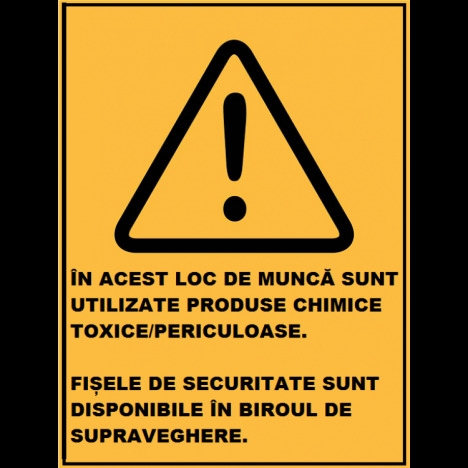 Vand Placuta pentru lucru cu produse periculoase chimice si toxice la un pret foarte avantajos! Placuta pentru lucru cu produse periculoase chimice si toxice Va putem oferi si alte dimensiuni, materiale sau modele separat la cerere. Noua modalitate de imprimare UV pentru semne si indicatoare este cea mai recenta tehnologie UV. Aceasta tehnica este mult mai eficienta decat o tehnica obisnuita de imprimare digitala. Atat calitatea sa net superioara, cat si versatilitatea sa la imprimarea diferitelor produse sunt foarte mari si largi O imprimare UV consta intr-o tehnica de imprimare prin care cerneala este aplicata pe un material sau obiect care urmeaza sa fie imprimat, care este apoi uscata instantaneu de un emitator de raze ultraviolete. Multe tipuri de compusi sunt folosite pentru a acoperi intreaga suprafata imprimata, inclusiv carbonat de calciu si caolinit. Aceasta imprimare UV este o metoda de imprimare digitala cu o noua tehnica care usuca cerneala. Poate fi folosit pe o gama larga de materiale, astfel incat poate imprima pe plastic, metal, hartie, carton, placi ceramice, sticla, lemn si multe altele. Disponibil: - Autocolant PVC - forex industrial - Dibond din aluminiu. - www.prevenirea.ro Telefon : 0724 306 714